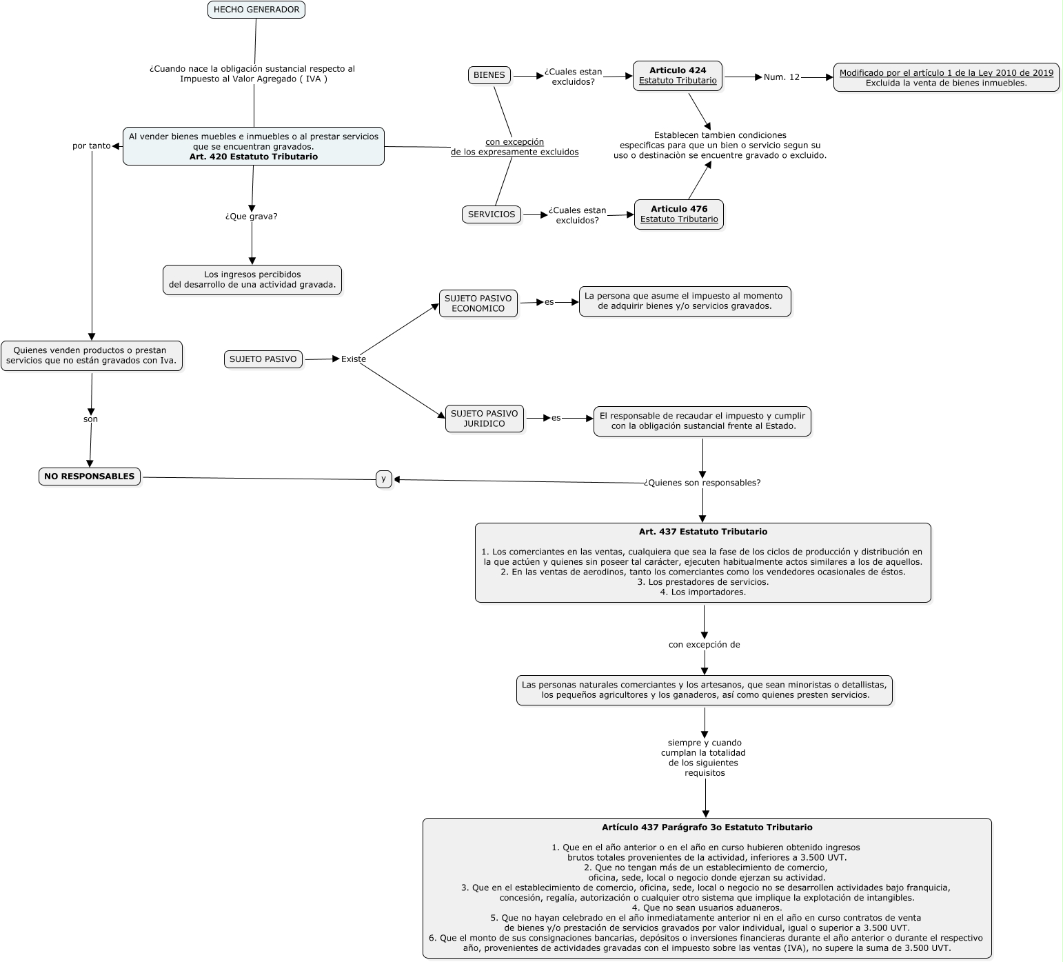 Este Cmap, tiene información relacionada con: Hecho generador, SUJETO PASIVO JURIDICO es El responsable de recaudar el impuesto y cumplir con la obligación sustancial frente al Estado., Quienes venden productos o prestan servicios que no están gravados con Iva. son NO RESPONSABLES, y ???? NO RESPONSABLES, SUJETO PASIVO ECONOMICO es La persona que asume el impuesto al momento de adquirir bienes y/o servicios gravados., SUJETO PASIVO Existe SUJETO PASIVO ECONOMICO, SERVICIOS ¿Cuales estan excluidos? Articulo 476 Estatuto Tributario, El responsable de recaudar el impuesto y cumplir con la obligación sustancial frente al Estado. ¿Quienes son responsables? Art. 437 Estatuto Tributario 1. Los comerciantes en las ventas, cualquiera que sea la fase de los ciclos de producción y distribución en la que actúen y quienes sin poseer tal carácter, ejecuten habitualmente actos similares a los de aquellos. 2. En las ventas de aerodinos, tanto los comerciantes como los vendedores ocasionales de éstos. 3. Los prestadores de servicios. 4. Los importadores., BIENES con excepción de los expresamente excluidos SERVICIOS, Articulo 424 Estatuto Tributario Num. 12 Modificado por el artículo 1 de la Ley 2010 de 2019 Excluida la venta de bienes inmuebles., Al vender bienes muebles e inmuebles o al prestar servicios que se encuentran gravados. Art. 420 Estatuto Tributario por tanto Quienes venden productos o prestan servicios que no están gravados con Iva., El responsable de recaudar el impuesto y cumplir con la obligación sustancial frente al Estado. ¿Quienes son responsables? y, BIENES ¿Cuales estan excluidos? Articulo 424 Estatuto Tributario, SUJETO PASIVO Existe SUJETO PASIVO JURIDICO, Al vender bienes muebles e inmuebles o al prestar servicios que se encuentran gravados. Art. 420 Estatuto Tributario ¿Que grava? Los ingresos percibidos del desarrollo de una actividad gravada., BIENES con excepción de los expresamente excluidos Al vender bienes muebles e inmuebles o al prestar servicios que se encuentran gravados. Art. 420 Estatuto Tributario, Las personas naturales comerciantes y los artesanos, que sean minoristas o detallistas, los pequeños agricultores y los ganaderos, así como quienes presten servicios. siempre y cuando cumplan la totalidad de los siguientes requisitos Artículo 437 Parágrafo 3o Estatuto Tributario 1. Que en el año anterior o en el año en curso hubieren obtenido ingresos brutos totales provenientes de la actividad, inferiores a 3.500 UVT. 2. Que no tengan más de un establecimiento de comercio, oficina, sede, local o negocio donde ejerzan su actividad. 3. Que en el establecimiento de comercio, oficina, sede, local o negocio no se desarrollen actividades bajo franquicia, concesión, regalía, autorización o cualquier otro sistema que implique la explotación de intangibles. 4. Que no sean usuarios aduaneros. 5. Que no hayan celebrado en el año inmediatamente anterior ni en el año en curso contratos de venta de bienes y/o prestación de servicios gravados por valor individual, igual o superior a 3.500 UVT. 6. Que el monto de sus consignaciones bancarias, depósitos o inversiones financieras durante el año anterior o durante el respectivo año, provenientes de actividades gravadas con el impuesto sobre las ventas (IVA), no supere la suma de 3.500 UVT., Art. 437 Estatuto Tributario 1. Los comerciantes en las ventas, cualquiera que sea la fase de los ciclos de producción y distribución en la que actúen y quienes sin poseer tal carácter, ejecuten habitualmente actos similares a los de aquellos. 2. En las ventas de aerodinos, tanto los comerciantes como los vendedores ocasionales de éstos. 3. Los prestadores de servicios. 4. Los importadores. con excepción de Las personas naturales comerciantes y los artesanos, que sean minoristas o detallistas, los pequeños agricultores y los ganaderos, así como quienes presten servicios., HECHO GENERADOR ¿Cuando nace la obligación sustancial respecto al Impuesto al Valor Agregado ( IVA ) Al vender bienes muebles e inmuebles o al prestar servicios que se encuentran gravados. Art. 420 Estatuto Tributario