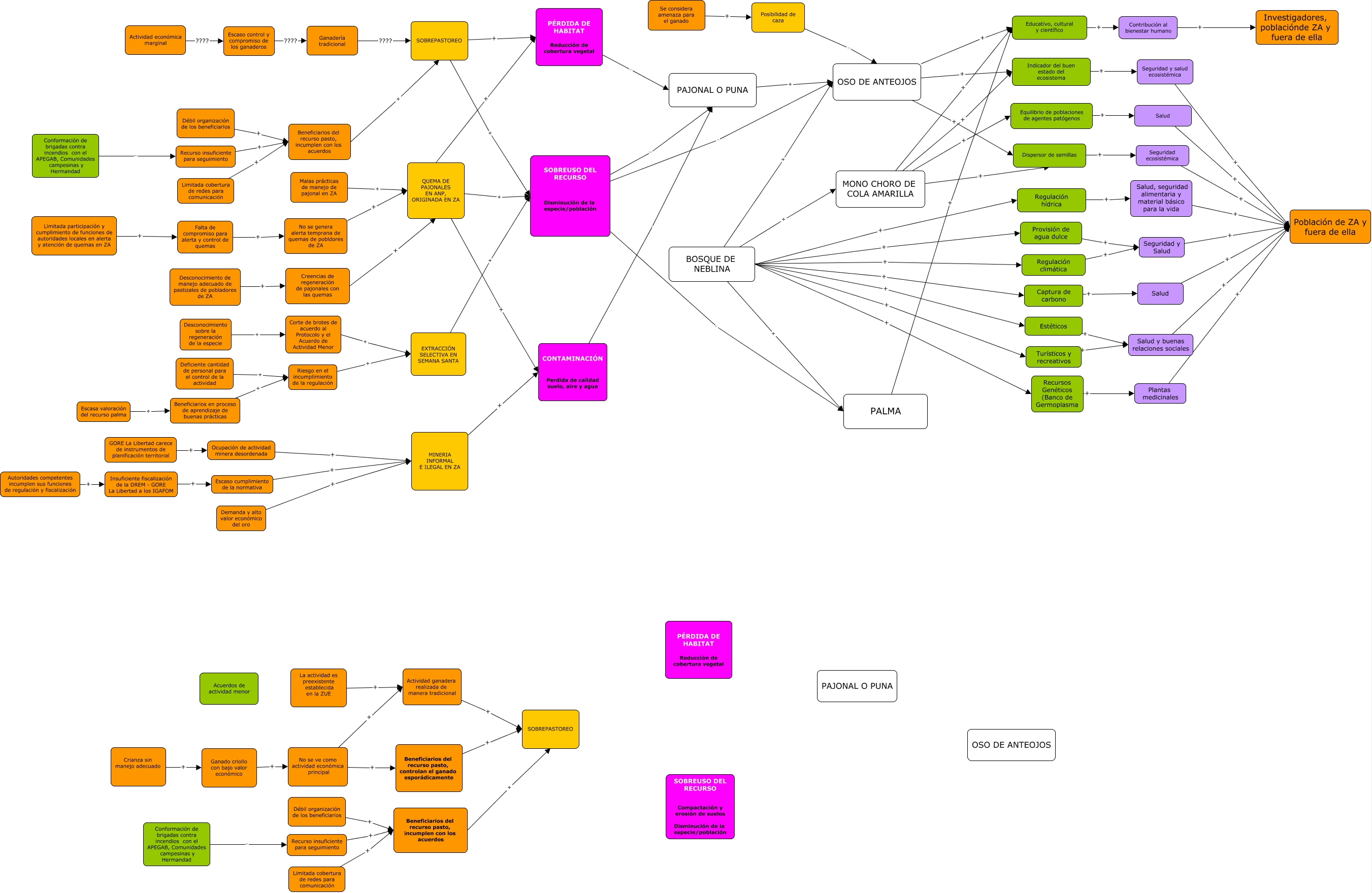 Este Cmap, tiene información relacionada con: MAPA CONCEPTUAL_CONSOLIDADO 2_08.11.2021, Dispersor de semillas + Seguridad ecosistémica, Se considera amenaza para el ganado + Posibilidad de caza, Beneficiarios del recurso pasto, incumplen con los acuerdos + SOBREPASTOREO, CONTAMINACIÓN Perdida de calidad suelo, aire y agua - PAJONAL O PUNA, Estéticos + Salud y buenas relaciones sociales, Recurso insuficiente para seguimiento + Beneficiarios del recurso pasto, incumplen con los acuerdos, Salud + Población de ZA y fuera de ella, Limitada participación y cumplimiento de funciones de autoridades locales en alerta y atención de quemas en ZA + Falta de compromiso para alerta y control de quemas, Desconocimiento de manejo adecuado de pastizales de pobladores de ZA + Creencias de regeneración de pajonales con las quemas, Demanda y alto valor económico del oro + MINERIA INFORMAL E ILEGAL EN ZA, MONO CHORO DE COLA AMARILLA + Equilibrio de poblaciones de agentes patógenos, Conformación de brigadas contra incendios con el APEGAB, Comunidades campesinas y Hermandad - Recurso insuficiente para seguimiento, Educativo, cultural y científico + Contribución al bienestar humano, Beneficiarios del recurso pasto, controlan el ganado esporádicamente + SOBREPASTOREO, BOSQUE DE NEBLINA + PALMA, Débil organización de los beneficiarios + Beneficiarios del recurso pasto, incumplen con los acuerdos, OSO DE ANTEOJOS + Dispersor de semillas, Conformación de brigadas contra incendios con el APEGAB, Comunidades campesinas y Hermandad - Recurso insuficiente para seguimiento, Malas prácticas de manejo de pajonal en ZA + QUEMA DE PAJONALES EN ANP, ORIGINADA EN ZA, Plantas medicinales + Población de ZA y fuera de ella