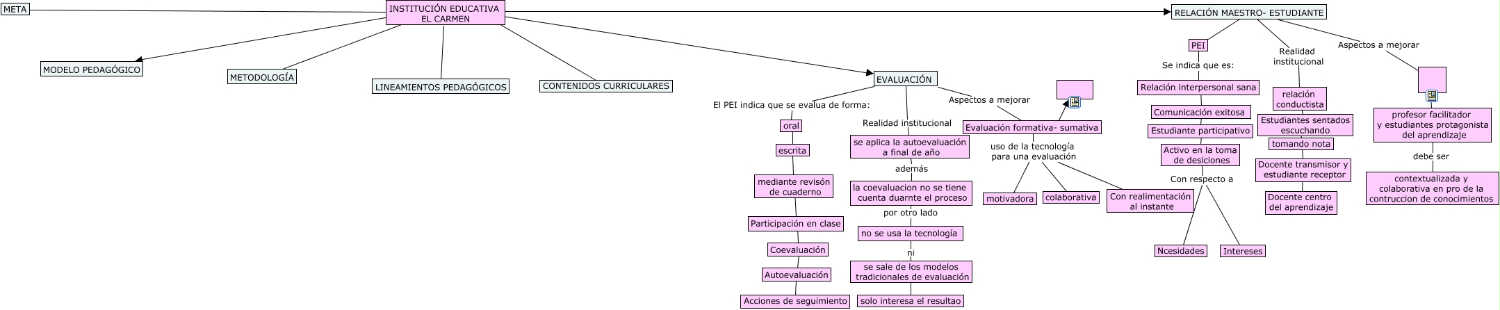 Este Cmap, tiene información relacionada con: I.E El Carmen, EVALUACIÓN Aspectos a mejorar Evaluación formativa- sumativa, PEI Se indica que es: Relación interpersonal sana, Docente transmisor y estudiante receptor ???? Docente centro del aprendizaje, se aplica la autoevaluación a final de año además la coevaluacion no se tiene cuenta duarnte el proceso, Activo en la toma de desiciones Con respecto a Ncesidades, Participación en clase ???? Coevaluación, EVALUACIÓN Realidad institucional se aplica la autoevaluación a final de año, escrita ???? mediante revisón de cuaderno, INSTITUCIÓN EDUCATIVA EL CARMEN ???? EVALUACIÓN, no se usa la tecnología ni se sale de los modelos tradicionales de evaluación, EVALUACIÓN El PEI indica que se evalua de forma: oral, RELACIÓN MAESTRO- ESTUDIANTE Realidad institucional relación conductista, Comunicación exitosa ???? Estudiante participativo, profesor facilitador y estudiantes protagonista del aprendizaje debe ser contextualizada y colaborativa en pro de la contruccion de conocimientos, mediante revisón de cuaderno ???? Participación en clase, INSTITUCIÓN EDUCATIVA EL CARMEN ???? META, Estudiantes sentados escuchando ???? tomando nota, Activo en la toma de desiciones Con respecto a Intereses, INSTITUCIÓN EDUCATIVA EL CARMEN ???? RELACIÓN MAESTRO- ESTUDIANTE, Evaluación formativa- sumativa uso de la tecnología para una evaluación Con realimentación al instante