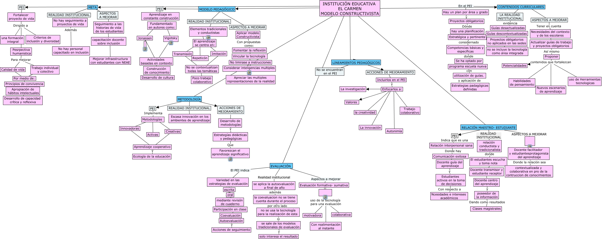 Este Cmap, tiene información relacionada con: I.E El Carmen, Aplicar modelo Constructivista Con propuestas como: Fomentar la reflexión, Fortalecer proyecto de vida Dirigido a Pesrpectiva humanistica, Fundamentado en autores como: ???? Vigotsky, hay una planificación ???? Estratégica y pertinente, Innovadoras ???? Aprendizaje cooperativo, METODOLOGÍA ???? PEI, INSTITUCIÓN EDUCATIVA EL CARMEN MODELO CONSTRUCTIVISTA ???? MODELO PEDAGÓGICO, Calidad de vida ???? Por medio de:, CONTENIDOS CURRICULARES En el PEI Hay un plan por área y grado, Evaluación formativa- sumativa uso de la tecnología para una evaluación Con realimentación al instante, no se usa la tecnología para la realización de esta ni se sale de los modelos tradicionales de evaluación, Actualizar guías de trabajo y proyectos obligatorios Así mismo Proponer, RELACIÓN MAESTRO- ESTUDIANTE REALIDAD INSTITUCIONAL relación conductista y tradicionalista, Vincular la tecnología ???? No limirase a instrucciones, Enfocarlos a: ???? la creatividad, relación conductista y tradicionalista donde El estudiantes escucha y toma nota, Fortalecer proyecto de vida Dirigido a Criterios de inclusión y diversidad, METODOLOGÍA ???? REALIDAD INSTITUCIONAL, RELACIÓN MAESTRO- ESTUDIANTE ASPECTOS A MEJORAR, No limirase a instrucciones ???? Considerar inteligencias multiples