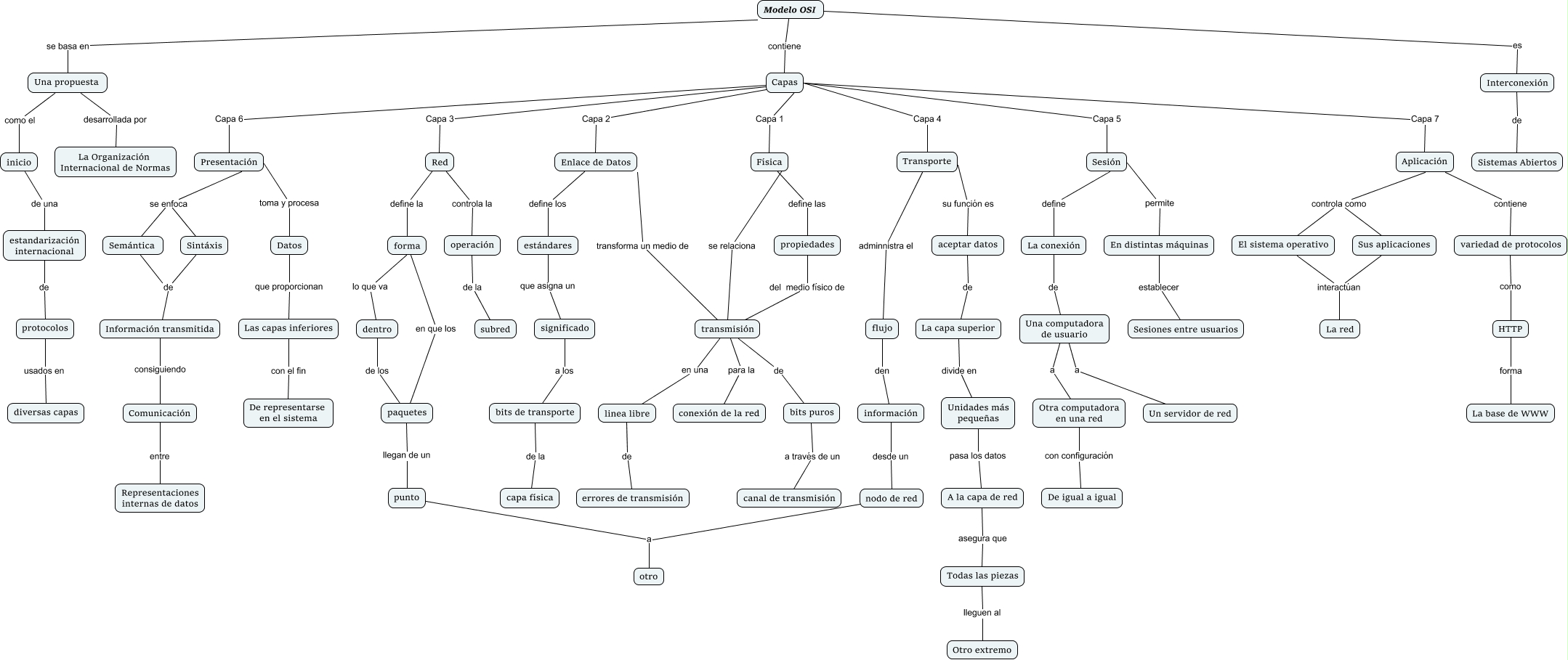 Este Cmap, tiene información relacionada con: Modelo ISO, Sintáxis de Información transmitida, Red controla la operación, Aplicación controla como El sistema operativo, En distintas máquinas establecer Sesiones entre usuarios, transmisión en una linea libre, forma lo que va dentro, punto a otro, forma en que los paquetes, propiedades del medio físico de transmisión, Todas las piezas lleguen al Otro extremo, Sesión define La conexión, protocolos usados en diversas capas, Presentación se enfoca Semántica, Presentación toma y procesa Datos, Comunicación entre Representaciones internas de datos, Capas Capa 6 Presentación, transmisión de bits puros, Capas Capa 7 Aplicación, Capas Capa 1 Física, estándares que asigna un significado