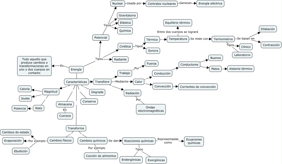 Este Cmap, tiene información relacionada con: Energía, Temperatura Se mide con Termometros, Termometros Se basan en Contracción, Energía Tipos Radiante, Transforma Cambios físicos, Cambios químicos Se dan Reacciones químicas, Energía Tipos Cinética, Termometros Tipos Clínico, Energía Es Todo aquello que produce cambios o transformaciones en uno o dos cuerpos en contacto, Reacciones químicas Representadas como Ecuaciones químicas, Termometros Se basan en Dilatación, Calor Convección, Características Almacena, Transfiere Mediante Calor, Cambios químicos Por ejemplo Cocción de alimentos, Conducción Conductores, Energía Características, Termometros Tipos Laboratorio, Potencial Tipos Gravitatoria, Potencial Tipos Química, Almacena En Cuerpos