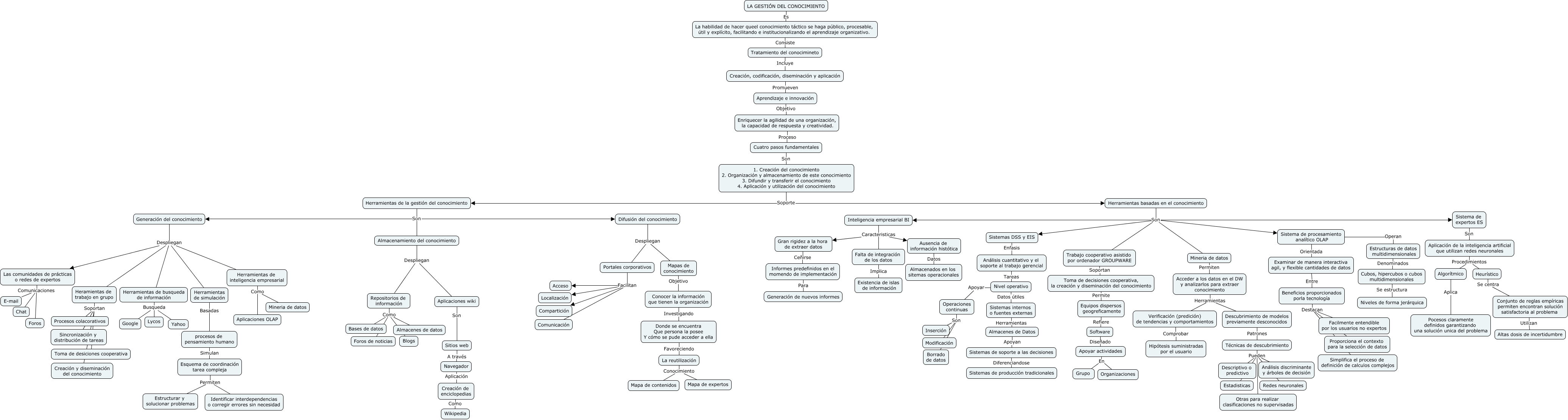 Este Cmap, tiene información relacionada con: ADMINISTRACIÓN DEL CONOCIMIENTO.cmap, Herramientas de la gestión del conocimiento Son Generación del conocimiento, Creación de enciclopedias Como Wikipedia, Generación del conocimiento Despliegan Herramientas de busqueda de información, Aplicación de la inteligencia artificial que utilizan redes neuronales Procedimientos Heurístico, Mapas de conocimiento Objetivo Conocer la información que tienen la organización, Esquema de coordinación tarea compleja Permiten Identificar interdependencias o corregir errores sin necesidad, Toma de decisiones cooperativa, la creación y diseminación del conocimiento Permite Equipos dispersos geogreficamente, Verificación (predición) de tendencias y comportamientos Comprobar Hipótesis suministradas por el usuario, Herramientas basadas en el conocimiento Son Trabajo cooperativo asistido por ordenador GROUPWARE, Inteligencia empresarial BI Caracteristicas Falta de integración de los datos, Beneficios proporcionados porla tecnología Destacan Proporciona el contexto para la selección de datos, Acceder a los datos en el DW y analizarlos para extraer conocimiento Herramientas Verificación (predición) de tendencias y comportamientos, Equipos dispersos geogreficamente Refiere Software, Beneficios proporcionados porla tecnología Destacan Simplifica el proceso de definición de calculos complejos, Almacenamiento del conocimiento Despliegan Repositorios de información, Enriquecer la agilidad de una organización, la capacidad de respuesta y creatividad. Proceso Cuatro pasos fundamentales, Herramientas de simulación Basadas procesos de pensamiento humano, Sistemas DSS y EIS Enfasis Análisis cuantitativo y el soporte al trabajo gerencial, Algorítmico Aplica Pocesos claramente definidos garantizando una solución unica del problema, Gran rigidez a la hora de extraer datos Ceñirse Informes predefinidos en el momendo de implementación