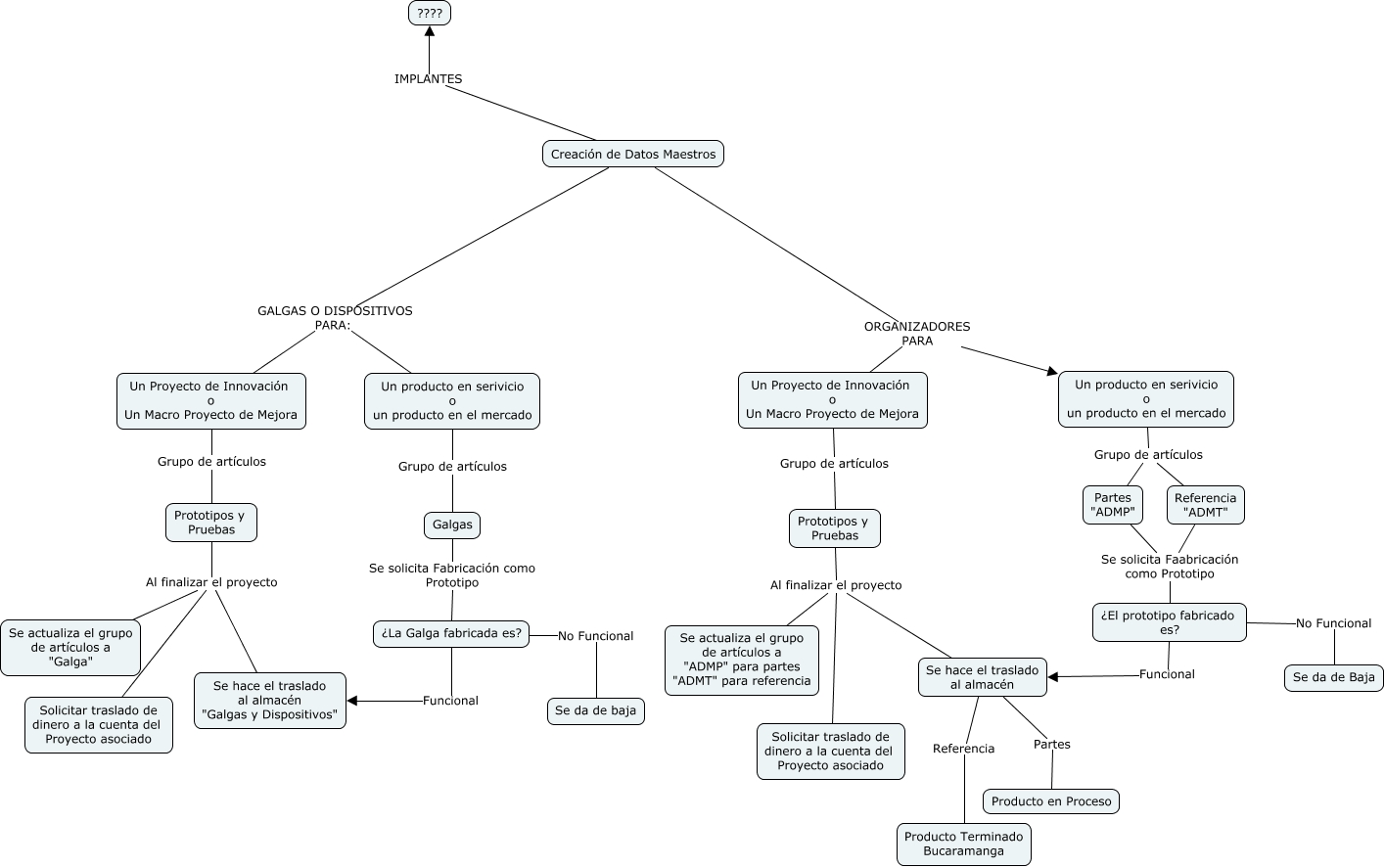 Este Cmap, tiene información relacionada con: Creación de Datos Maestros, Un Proyecto de Innovación o Un Macro Proyecto de Mejora Grupo de artículos Prototipos y Pruebas, Partes "ADMP" Se solicita Faabricación como Prototipo ¿El prototipo fabricado es?, Prototipos y Pruebas Al finalizar el proyecto Solicitar traslado de dinero a la cuenta del Proyecto asociado, Prototipos y Pruebas Al finalizar el proyecto Se actualiza el grupo de artículos a "Galga", Un Proyecto de Innovación o Un Macro Proyecto de Mejora Grupo de artículos Prototipos y Pruebas, Creación de Datos Maestros ORGANIZADORES PARA Un Proyecto de Innovación o Un Macro Proyecto de Mejora, Se hace el traslado al almacén Referencia Producto Terminado Bucaramanga, Un producto en serivicio o un producto en el mercado Grupo de artículos Referencia "ADMT", Prototipos y Pruebas Al finalizar el proyecto Se hace el traslado al almacén, Prototipos y Pruebas Al finalizar el proyecto Se hace el traslado al almacén "Galgas y Dispositivos", Prototipos y Pruebas Al finalizar el proyecto Solicitar traslado de dinero a la cuenta del Proyecto asociado, ¿La Galga fabricada es? No Funcional Se da de baja, ¿El prototipo fabricado es? Funcional Se hace el traslado al almacén, ¿La Galga fabricada es? Funcional Se hace el traslado al almacén "Galgas y Dispositivos", Galgas Se solicita Fabricación como Prototipo ¿La Galga fabricada es?, Se hace el traslado al almacén Partes Producto en Proceso, Creación de Datos Maestros GALGAS O DISPOSITIVOS PARA: Un producto en serivicio o un producto en el mercado, Un producto en serivicio o un producto en el mercado Grupo de artículos Partes "ADMP", ¿El prototipo fabricado es? No Funcional Se da de Baja, Un producto en serivicio o un producto en el mercado Grupo de artículos Galgas