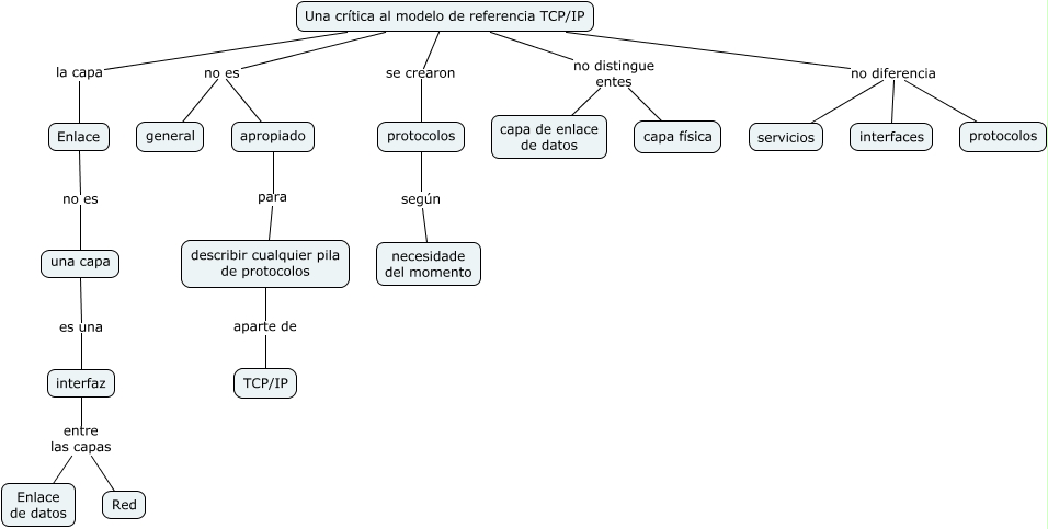 Este Cmap, tiene información relacionada con: 1.4.6 Una crítica al modelo de referencia TCP-IP, apropiado para describir cualquier pila de protocolos, Una crítica al modelo de referencia TCP/IP no distingue entes capa de enlace de datos, Una crítica al modelo de referencia TCP/IP no es general, Enlace no es una capa, Una crítica al modelo de referencia TCP/IP no diferencia interfaces, interfaz entre las capas Enlace de datos, Una crítica al modelo de referencia TCP/IP no es apropiado, una capa es una interfaz, Una crítica al modelo de referencia TCP/IP se crearon protocolos, describir cualquier pila de protocolos aparte de TCP/IP, protocolos según necesidade del momento, Una crítica al modelo de referencia TCP/IP no distingue entes capa física, Una crítica al modelo de referencia TCP/IP la capa Enlace, Una crítica al modelo de referencia TCP/IP no diferencia protocolos, interfaz entre las capas Red, Una crítica al modelo de referencia TCP/IP no diferencia servicios