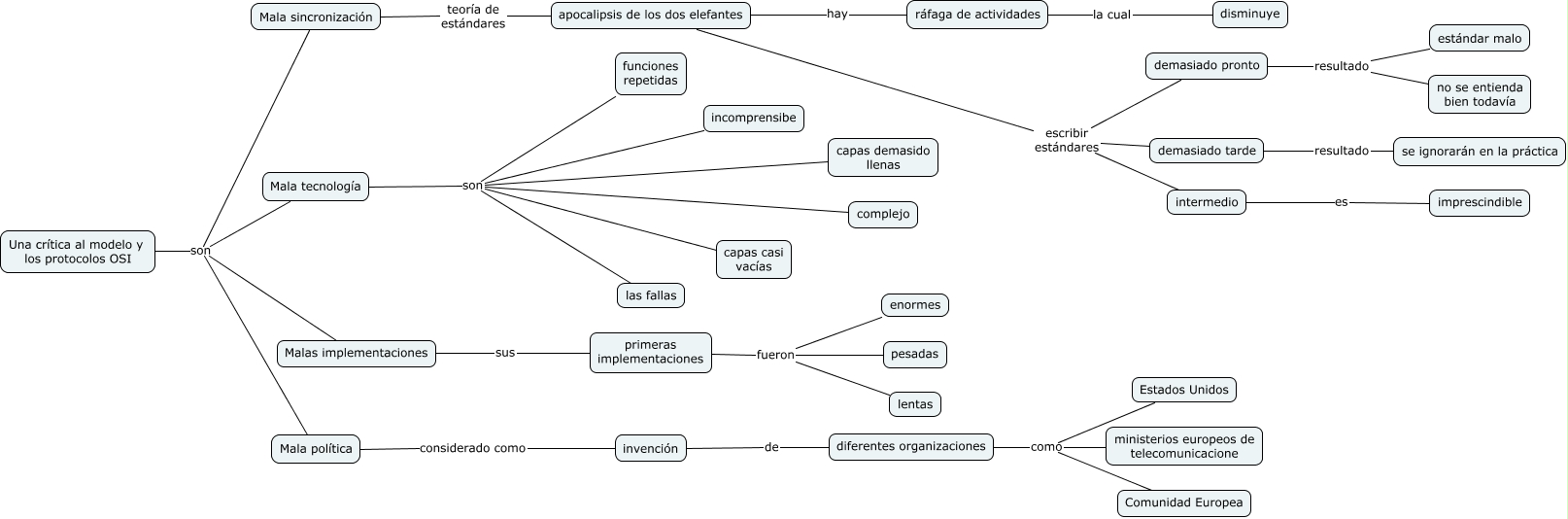 Este Cmap, tiene información relacionada con: 1.4.5 Una crítica al modelo y los protocolos OSI, apocalipsis de los dos elefantes escribir estándares demasiado pronto, apocalipsis de los dos elefantes escribir estándares demasiado tarde, Mala tecnología son incomprensibe, primeras implementaciones fueron lentas, Mala tecnología son las fallas, invención de diferentes organizaciones, Mala tecnología son capas demasido llenas, diferentes organizaciones como Comunidad Europea, diferentes organizaciones como ministerios europeos de telecomunicacione, Una crítica al modelo y los protocolos OSI son Mala tecnología, Mala tecnología son complejo, Una crítica al modelo y los protocolos OSI son Mala política, diferentes organizaciones como Estados Unidos, demasiado tarde resultado se ignorarán en la práctica, primeras implementaciones fueron pesadas, primeras implementaciones fueron enormes, apocalipsis de los dos elefantes hay ráfaga de actividades, Mala tecnología son funciones repetidas, ráfaga de actividades la cual disminuye, Malas implementaciones sus primeras implementaciones