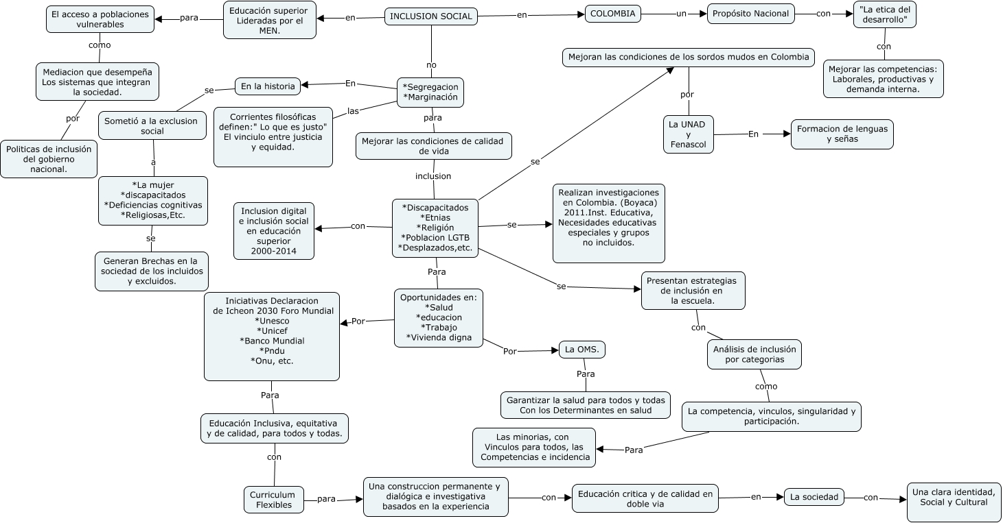Este Cmap, tiene información relacionada con: Inclusión Social, Presentan estrategias de inclusión en la escuela. con Análisis de inclusión por categorias, "La etica del desarrollo" con Mejorar las competencias: Laborales, productivas y demanda interna., *Discapacitados *Etnias *Religión *Poblacion LGTB *Desplazados,etc. se Realizan investigaciones en Colombia. (Boyaca) 2011.Inst. Educativa, Necesidades educativas especiales y grupos no incluidos., *Discapacitados *Etnias *Religión *Poblacion LGTB *Desplazados,etc. se Mejoran las condiciones de los sordos mudos en Colombia, Análisis de inclusión por categorias como La competencia, vinculos, singularidad y participación., INCLUSION SOCIAL no *Segregacion *Marginación, *Segregacion *Marginación las Corrientes filosóficas definen:" Lo que es justo" El vinciulo entre justicia y equidad., *Discapacitados *Etnias *Religión *Poblacion LGTB *Desplazados,etc. Para Oportunidades en: *Salud *educacion *Trabajo *Vivienda digna, Educación critica y de calidad en doble via en La sociedad, *La mujer *discapacitados *Deficiencias cognitivas *Religiosas,Etc. se Generan Brechas en la sociedad de los incluidos y excluidos., Educación superior Lideradas por el MEN. para El acceso a poblaciones vulnerables, *Discapacitados *Etnias *Religión *Poblacion LGTB *Desplazados,etc. con Inclusion digital e inclusión social en educación superior 2000-2014, *Discapacitados *Etnias *Religión *Poblacion LGTB *Desplazados,etc. se Presentan estrategias de inclusión en la escuela., Oportunidades en: *Salud *educacion *Trabajo *Vivienda digna Por La OMS., Mejorar las condiciones de calidad de vida inclusion *Discapacitados *Etnias *Religión *Poblacion LGTB *Desplazados,etc., *Segregacion *Marginación En En la historia, La UNAD y Fenascol En Formacion de lenguas y señas, Sometió a la exclusion social a *La mujer *discapacitados *Deficiencias cognitivas *Religiosas,Etc., INCLUSION SOCIAL en COLOMBIA, La competencia, vinculos, singularidad y participación. Para Las minorias, con Vinculos para todos, las Competencias e incidencia