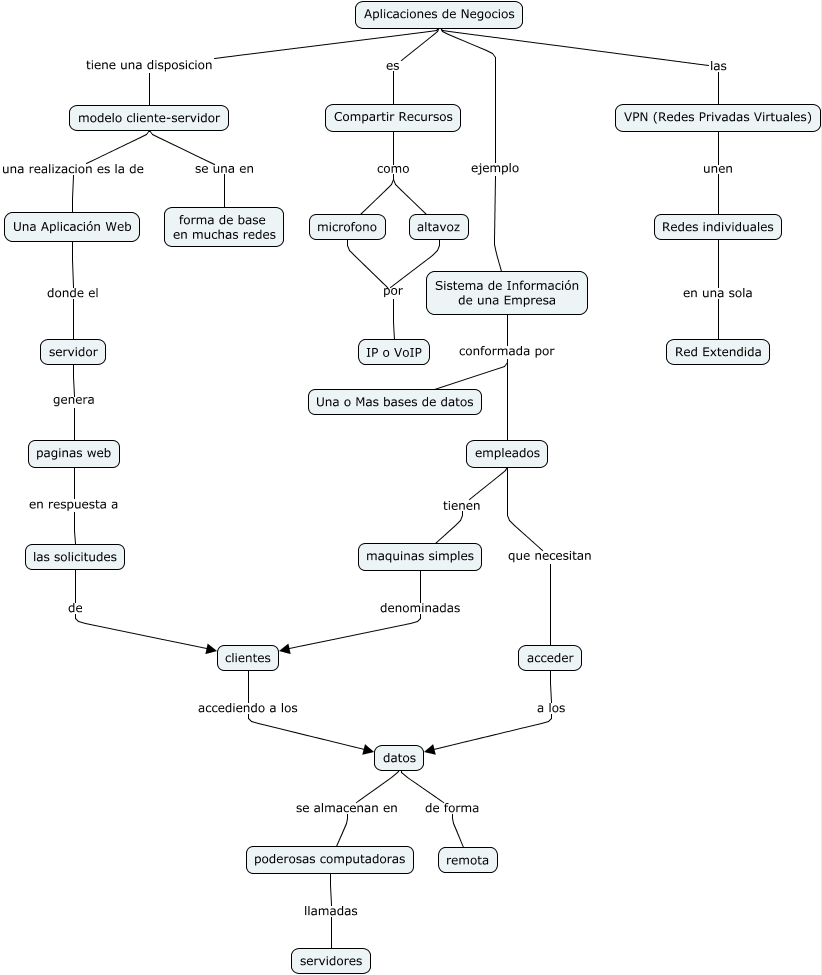Este Cmap, tiene información relacionada con: 1.1.1 Aplicaciones de Negocios, modelo cliente-servidor se una en forma de base en muchas redes, maquinas simples denominadas clientes, Aplicaciones de Negocios es Compartir Recursos, Redes individuales en una sola Red Extendida, poderosas computadoras llamadas servidores, datos se almacenan en poderosas computadoras, Aplicaciones de Negocios las VPN (Redes Privadas Virtuales), clientes accediendo a los datos, microfono por IP o VoIP, Sistema de Información de una Empresa conformada por empleados, datos de forma remota, Compartir Recursos como altavoz, modelo cliente-servidor una realizacion es la de Una Aplicación Web, empleados que necesitan acceder, altavoz por IP o VoIP, servidor genera paginas web, Sistema de Información de una Empresa conformada por Una o Mas bases de datos, Una Aplicación Web donde el servidor, acceder a los datos, las solicitudes de clientes