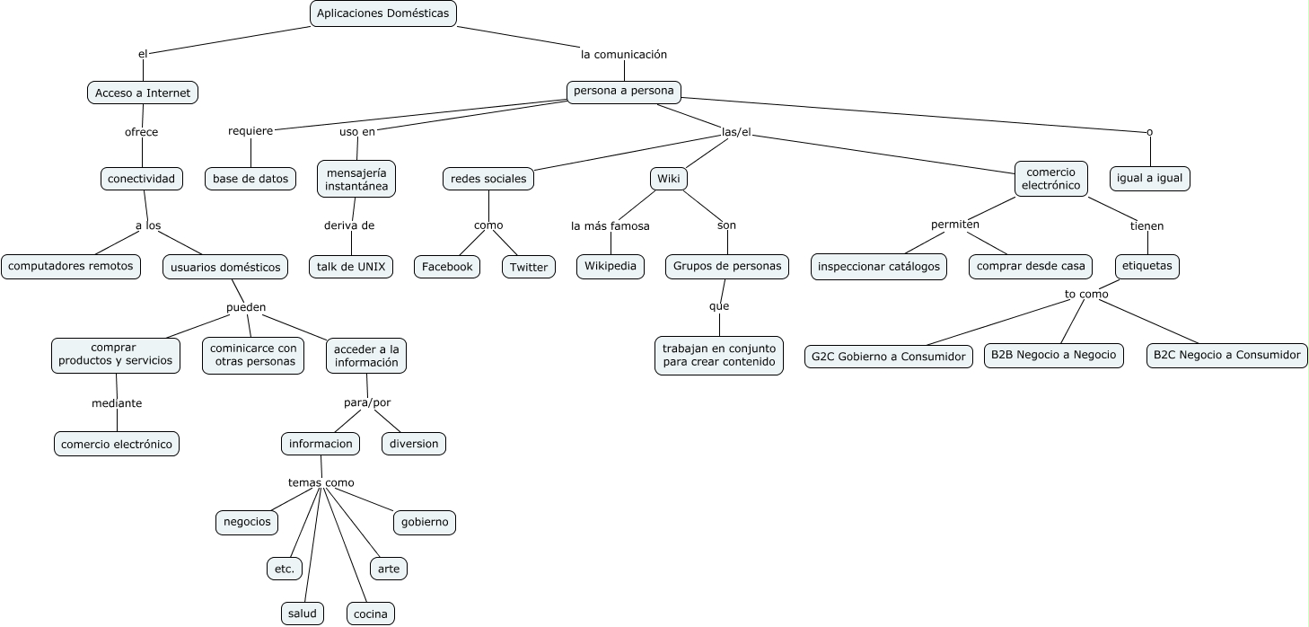 Este Cmap, tiene información relacionada con: 1.1.2 Aplicaciones Domésticas, informacion temas como negocios, persona a persona las/el comercio electrónico, comercio electrónico permiten inspeccionar catálogos, informacion temas como arte, comercio electrónico permiten comprar desde casa, Acceso a Internet ofrece conectividad, etiquetas to como B2C Negocio a Consumidor, informacion temas como salud, usuarios domésticos pueden comprar productos y servicios, Grupos de personas que trabajan en conjunto para crear contenido, acceder a la información para/por informacion, persona a persona las/el Wiki, comercio electrónico tienen etiquetas, comprar productos y servicios mediante comercio electrónico, redes sociales como Facebook, Wiki son Grupos de personas, usuarios domésticos pueden acceder a la información, persona a persona uso en mensajería instantánea, Aplicaciones Domésticas el Acceso a Internet, informacion temas como etc.