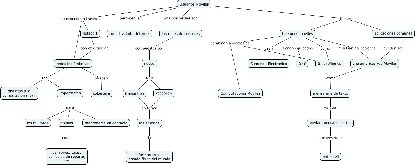 Este Cmap, tiene información relacionada con: 1.1.3 Usuarios Móviles, importantes para flotillas, hotsport son otro tipo de redes inalámbricas, Usuarios Móviles permiten la conectividad a Internet, flotillas como camiones, taxis, vehículos de reparto, etc., transmiten en forma inalámbrica, Usuarios Móviles tienen aplicaciones comunes, mensajería de texto ya que envian mensajes cortos, SmartPhones combinan aspectos de telefonos moviles, telefonos moviles tienen equipados GPS, las redes de sensores compuestas por nodos, nodos que transmiten, Usuarios Móviles tienen telefonos moviles, redes inalámbricas ofrecen cobertura, redes inalámbricas son distintas a la computación móvil, Usuarios Móviles se conectan a través de hotsport, nodos que recopilan, recopilan en forma inalámbrica, SmartPhones combinan aspectos de Computadoras Móviles, telefonos moviles como SmartPhones, telefonos moviles impulsan aplicaciones Inalámbricas y/o Moviles