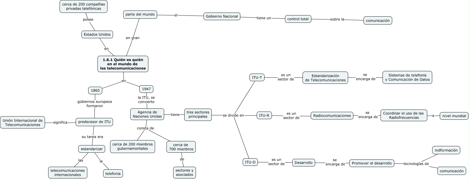 Este Cmap, tiene información relacionada con: 1.6.1 Quién es quién en el mundo de las telecomunicaciones, Gobierno Nacional tiene un control total, tres sectores principales se divide en ITU-T, cerca de 700 mienbros de sectores y asociados, tres sectores principales se divide en ITU-R, parte del mundo el Gobierno Nacional, 1.6.1 Quién es quién en el mundo de las telecomunicaciones en 1947, Promover el desarrollo tecnologías de comunicación, Promover el desarrollo tecnologías de indformación, control total sobre la comunicación, tres sectores principales se divide en ITU-D, 1.6.1 Quién es quién en el mundo de las telecomunicaciones en 1865, Agencia de Naciones Unidas consta de cerca de 700 mienbros, Estandarización de Telecomunicaciones se encarga de Sistemas de telefonía y Comunicación de Datos, Agencia de Naciones Unidas tiene tres sectores principales, Coordinar el uso de las Radiofrecuencias a nivel mundial, ITU-T es un sector de Estandarización de Telecomunicaciones, estandarizar la telefonía, Estados Unidos posee cerca de 200 compañías privadas telefónicas, 1947 la ITU, se convierte Agencia de Naciones Unidas, Agencia de Naciones Unidas consta de cerca de 200 mienbros gubernamentales