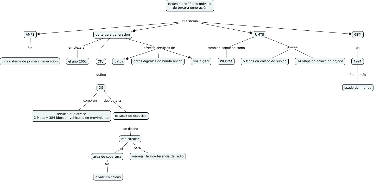 Este Cmap, tiene información relacionada con: 1.5.2 Redes de teléfonos móviles de tercera generación, Redes de teléfonos móviles de tercera generación el sistema AMPS, de tercera generación la ITU, Redes de teléfonos móviles de tercera generación el sistema GSM, AMPS fue uns sistema de primera generación, red circular para manejar la interferencia de radio, de tercera generación ofrecen servicios de voz digital, de tercera generación empieza en el año 2001, escasez de espectro se diseño red circular, Redes de teléfonos móviles de tercera generación el sistema de tercera generación, UMTS tambien conocido como WCDMA, de tercera generación ofrecen servicios de datos, UMTS provee 14 Mbps en enlace de bajada, GSM en 1991, area de cobertura se divide en celdas, ITU define 3G, Redes de teléfonos móviles de tercera generación el sistema UMTS, UMTS provee 6 Mbps en enlace de subida, red circular el area de cobertura, 3G como un servicio que ofrece 2 Mbps y 384 kbps en vehiculos en movimiento, 3G debido a la escasez de espectro