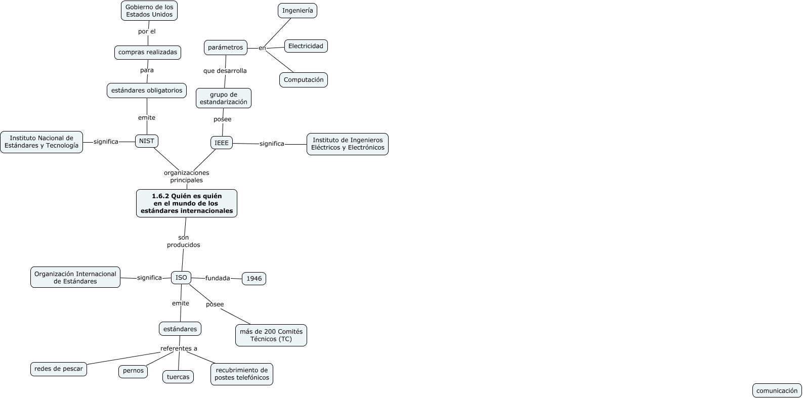 Este Cmap, tiene información relacionada con: 1.6.2 Quién es quién en el mundo de los estándares internacionales, parámetros en Ingeniería, NIST significa Instituto Nacional de Estándares y Tecnología, IEEE posee grupo de estandarización, parámetros en Electricidad, compras realizadas por el Gobierno de los Estados Unidos, ISO fundada 1946, estándares referentes a pernos, NIST emite estándares obligatorios, parámetros en Computación, estándares obligatorios para compras realizadas, grupo de estandarización que desarrolla parámetros, IEEE organizaciones principales NIST, ISO emite estándares, 1.6.2 Quién es quién en el mundo de los estándares internacionales organizaciones principales NIST, estándares referentes a tuercas, estándares referentes a redes de pescar, estándares referentes a recubrimiento de postes telefónicos, ISO significa Organización Internacional de Estándares, IEEE significa Instituto de Ingenieros Eléctricos y Electrónicos, ISO posee más de 200 Comités Técnicos (TC)