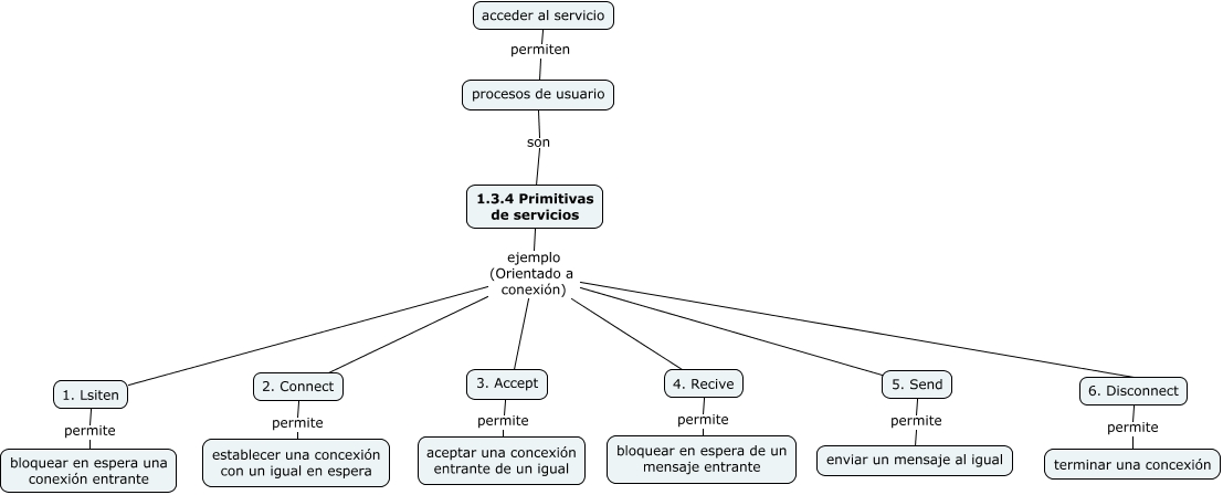 Este Cmap, tiene información relacionada con: 1.3.4 Primitivas de servicios, 6. Disconnect permite terminar una concexión, 1.3.4 Primitivas de servicios ejemplo (Orientado a conexión) 5. Send, procesos de usuario permiten acceder al servicio, 3. Accept permite aceptar una concexión entrante de un igual, 5. Send permite enviar un mensaje al igual, 1.3.4 Primitivas de servicios ejemplo (Orientado a conexión) 3. Accept, 4. Recive permite bloquear en espera de un mensaje entrante, 1.3.4 Primitivas de servicios ejemplo (Orientado a conexión) 2. Connect, 1. Lsiten permite bloquear en espera una conexión entrante, 1.3.4 Primitivas de servicios ejemplo (Orientado a conexión) 4. Recive, 1.3.4 Primitivas de servicios ejemplo (Orientado a conexión) 1. Lsiten, 1.3.4 Primitivas de servicios ejemplo (Orientado a conexión) 6. Disconnect, 1.3.4 Primitivas de servicios son procesos de usuario, 2. Connect permite establecer una concexión con un igual en espera