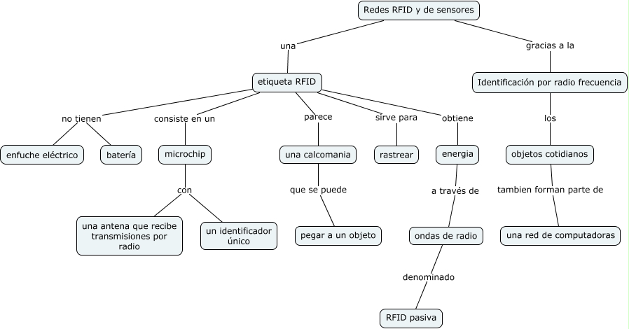Este Cmap, tiene información relacionada con: Redes RFID y de sensores, microchip con un identificador único, etiqueta RFID parece una calcomania, etiqueta RFID obtiene energia, Redes RFID y de sensores una etiqueta RFID, microchip con una antena que recibe transmisiones por radio, Redes RFID y de sensores gracias a la Identificación por radio frecuencia, etiqueta RFID consiste en un microchip, Identificación por radio frecuencia los objetos cotidianos, objetos cotidianos tambien forman parte de una red de computadoras, etiqueta RFID no tienen batería, etiqueta RFID no tienen enfuche eléctrico, etiqueta RFID sirve para rastrear, energia a través de ondas de radio, una calcomania que se puede pegar a un objeto, ondas de radio denominado RFID pasiva