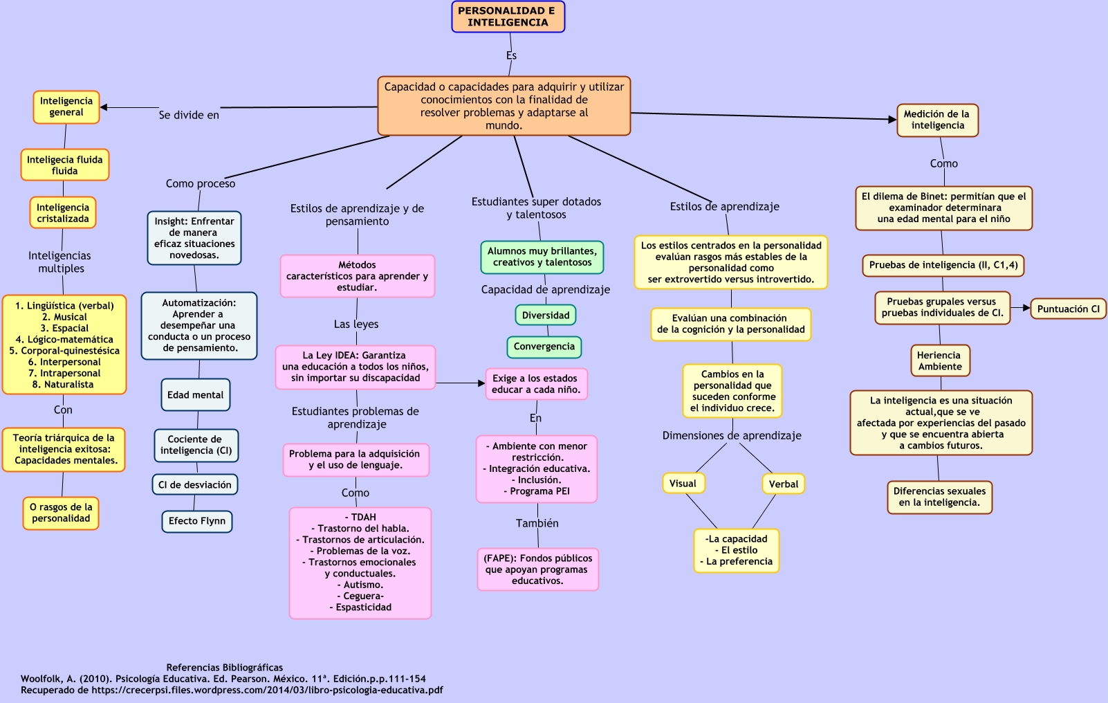 Este Cmap, tiene información relacionada con: Actividad 4 - Un sistema educativo incluyente, Capacidad o capacidades para adquirir y utilizar conocimientos con la finalidad de resolver problemas y adaptarse al mundo. Como proceso Insight: Enfrentar de manera eficaz situaciones novedosas., Visual ???? -La capacidad - El estilo - La preferencia, Heriencia Ambiente ???? La inteligencia es una situación actual,que se ve afectada por experiencias del pasado y que se encuentra abierta a cambios futuros., Cociente de inteligencia (CI) CI de desviación, Insight: Enfrentar de manera eficaz situaciones novedosas. ???? Automatización: Aprender a desempeñar una conducta o un proceso de pensamiento., Inteligecia fluida fluida ???? Inteligencia cristalizada, CI de desviación ???? Efecto Flynn, Pruebas grupales versus pruebas individuales de CI. ???? Puntuación CI, La Ley IDEA: Garantiza una educación a todos los niños, sin importar su discapacidad Estudiantes problemas de aprendizaje Problema para la adquisición y el uso de lenguaje., Capacidad o capacidades para adquirir y utilizar conocimientos con la finalidad de resolver problemas y adaptarse al mundo. ???? Medición de la inteligencia, Teoría triárquica de la inteligencia exitosa: Capacidades mentales. ???? O rasgos de la personalidad, Los estilos centrados en la personalidad evalúan rasgos más estables de la personalidad como ser extrovertido versus introvertido. ???? Evalúan una combinación de la cognición y la personalidad, 1. Lingüística (verbal) 2. Musical 3. Espacial 4. Lógico-matemática 5. Corporal-quinestésica 6. Interpersonal 7. Intrapersonal 8. Naturalista Con Teoría triárquica de la inteligencia exitosa: Capacidades mentales., El dilema de Binet: permitían que el examinador determinara una edad mental para el niño ???? Pruebas de inteligencia (II, C1,4), Métodos característicos para aprender y estudiar. Las leyes La Ley IDEA: Garantiza una educación a todos los niños, sin importar su discapacidad, Medición de la inteligencia Como El dilema de Binet: permitían que el examinador determinara una edad mental para el niño, Capacidad o capacidades para adquirir y utilizar conocimientos con la finalidad de resolver problemas y adaptarse al mundo. Estilos de aprendizaje y de pensamiento Métodos característicos para aprender y estudiar., Capacidad o capacidades para adquirir y utilizar conocimientos con la finalidad de resolver problemas y adaptarse al mundo. Estilos de aprendizaje Los estilos centrados en la personalidad evalúan rasgos más estables de la personalidad como ser extrovertido versus introvertido., Pruebas grupales versus pruebas individuales de CI. ???? Heriencia Ambiente, Cambios en la personalidad que suceden conforme el individuo crece. Dimensiones de aprendizaje Visual