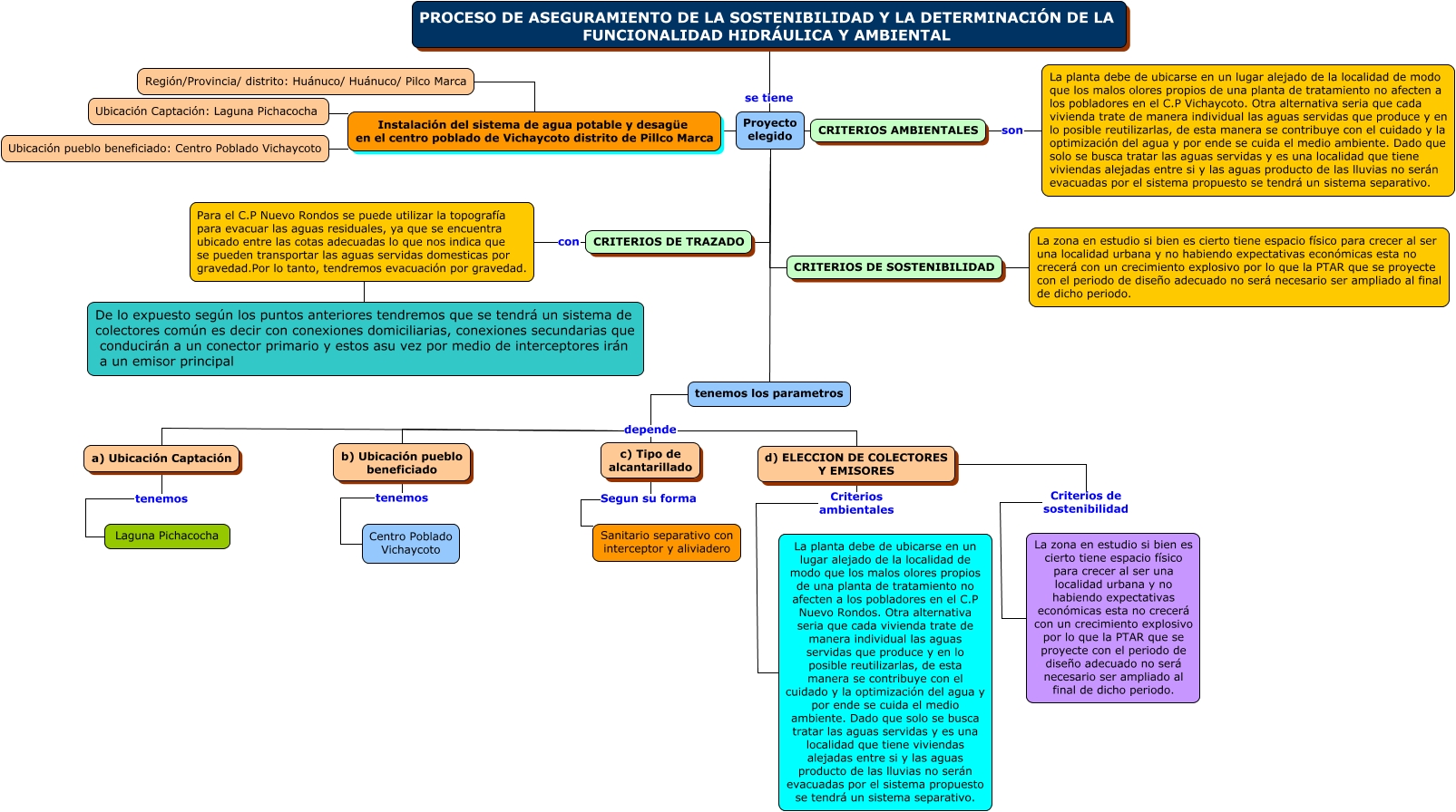 Este Cmap, tiene información relacionada con: Mapa 1 de Abastecimiento de Agua y Alcantarillado - ESC. N°14, Proyecto elegido CRITERIOS DE SOSTENIBILIDAD, Instalación del sistema de agua potable y desagüe en el centro poblado de Vichaycoto distrito de Pillco Marca Región/Provincia/ distrito: Huánuco/ Huánuco/ Pilco Marca, tenemos los parametros depende d) ELECCION DE COLECTORES Y EMISORES, a) Ubicación Captación tenemos Laguna Pichacocha, PROCESO DE ASEGURAMIENTO DE LA SOSTENIBILIDAD Y LA DETERMINACIÓN DE LA FUNCIONALIDAD HIDRÁULICA Y AMBIENTAL se tiene Proyecto elegido, c) Tipo de alcantarillado Segun su forma Sanitario separativo con interceptor y aliviadero, d) ELECCION DE COLECTORES Y EMISORES Criterios ambientales La planta debe de ubicarse en un lugar alejado de la localidad de modo que los malos olores propios de una planta de tratamiento no afecten a los pobladores en el C.P Nuevo Rondos. Otra alternativa seria que cada vivienda trate de manera individual las aguas servidas que produce y en lo posible reutilizarlas, de esta manera se contribuye con el cuidado y la optimización del agua y por ende se cuida el medio ambiente. Dado que solo se busca tratar las aguas servidas y es una localidad que tiene viviendas alejadas entre si y las aguas producto de las lluvias no serán evacuadas por el sistema propuesto se tendrá un sistema separativo., Instalación del sistema de agua potable y desagüe en el centro poblado de Vichaycoto distrito de Pillco Marca Ubicación pueblo beneficiado: Centro Poblado Vichaycoto, tenemos los parametros depende a) Ubicación Captación, tenemos los parametros depende b) Ubicación pueblo beneficiado, d) ELECCION DE COLECTORES Y EMISORES Criterios de sostenibilidad La zona en estudio si bien es cierto tiene espacio físico para crecer al ser una localidad urbana y no habiendo expectativas económicas esta no crecerá con un crecimiento explosivo por lo que la PTAR que se proyecte con el periodo de diseño adecuado no será necesario ser ampliado al final de dicho periodo., CRITERIOS AMBIENTALES son La planta debe de ubicarse en un lugar alejado de la localidad de modo que los malos olores propios de una planta de tratamiento no afecten a los pobladores en el C.P Vichaycoto. Otra alternativa seria que cada vivienda trate de manera individual las aguas servidas que produce y en lo posible reutilizarlas, de esta manera se contribuye con el cuidado y la optimización del agua y por ende se cuida el medio ambiente. Dado que solo se busca tratar las aguas servidas y es una localidad que tiene viviendas alejadas entre si y las aguas producto de las lluvias no serán evacuadas por el sistema propuesto se tendrá un sistema separativo., Instalación del sistema de agua potable y desagüe en el centro poblado de Vichaycoto distrito de Pillco Marca Ubicación Captación: Laguna Pichacocha, Proyecto elegido tenemos los parametros, Proyecto elegido CRITERIOS DE TRAZADO, Para el C.P Nuevo Rondos se puede utilizar la topografía para evacuar las aguas residuales, ya que se encuentra ubicado entre las cotas adecuadas lo que nos indica que se pueden transportar las aguas servidas domesticas por gravedad.Por lo tanto, tendremos evacuación por gravedad. De lo expuesto según los puntos anteriores tendremos que se tendrá un sistema de colectores común es decir con conexiones domiciliarias, conexiones secundarias que conducirán a un conector primario y estos asu vez por medio de interceptores irán a un emisor principal, Proyecto elegido CRITERIOS AMBIENTALES, tenemos los parametros depende c) Tipo de alcantarillado, CRITERIOS DE TRAZADO con Para el C.P Nuevo Rondos se puede utilizar la topografía para evacuar las aguas residuales, ya que se encuentra ubicado entre las cotas adecuadas lo que nos indica que se pueden transportar las aguas servidas domesticas por gravedad.Por lo tanto, tendremos evacuación por gravedad., Proyecto elegido Instalación del sistema de agua potable y desagüe en el centro poblado de Vichaycoto distrito de Pillco Marca