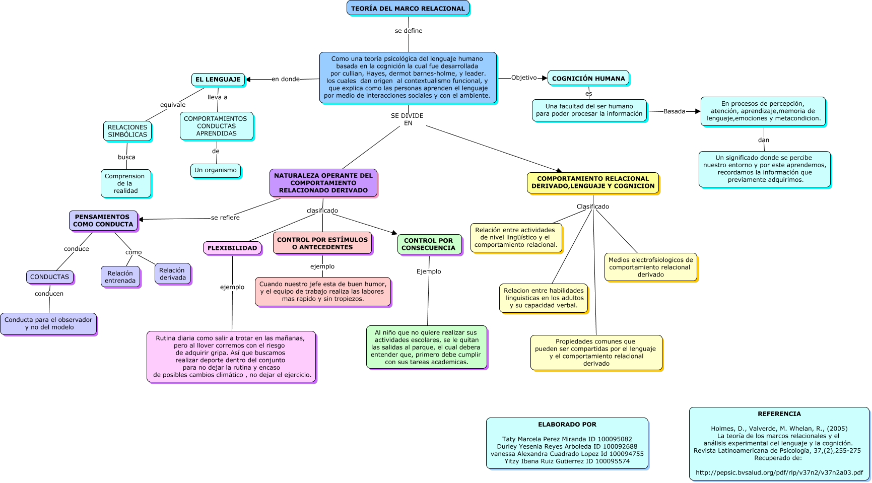 Este Cmap, tiene información relacionada con: teoria relacional del comportamiento, Como una teoría psicológica del lenguaje humano basada en la cognición la cual fue desarrollada por cullian, Hayes, dermot barnes-holme, y leader. los cuales dan origen al contextualismo funcional, y que explica como las personas aprenden el lenguaje por medio de interacciones sociales y con el ambiente. en donde EL LENGUAJE, NATURALEZA OPERANTE DEL COMPORTAMIENTO RELACIONADO DERIVADO se refiere PENSAMIENTOS COMO CONDUCTA, NATURALEZA OPERANTE DEL COMPORTAMIENTO RELACIONADO DERIVADO clasificado CONTROL POR ESTÍMULOS O ANTECEDENTES, COMPORTAMIENTOS CONDUCTAS APRENDIDAS de Un organismo, Como una teoría psicológica del lenguaje humano basada en la cognición la cual fue desarrollada por cullian, Hayes, dermot barnes-holme, y leader. los cuales dan origen al contextualismo funcional, y que explica como las personas aprenden el lenguaje por medio de interacciones sociales y con el ambiente. SE DIVIDE EN NATURALEZA OPERANTE DEL COMPORTAMIENTO RELACIONADO DERIVADO, PENSAMIENTOS COMO CONDUCTA como Relación derivada, NATURALEZA OPERANTE DEL COMPORTAMIENTO RELACIONADO DERIVADO clasificado CONTROL POR CONSECUENCIA, CONTROL POR CONSECUENCIA Ejemplo Al niño que no quiere realizar sus actividades escolares, se le quitan las salidas al parque, el cual debera entender que, primero debe cumplir con sus tareas academicas., CONTROL POR ESTÍMULOS O ANTECEDENTES ejemplo Cuando nuestro jefe esta de buen humor, y el equipo de trabajo realiza las labores mas rapido y sin tropiezos., PENSAMIENTOS COMO CONDUCTA conduce CONDUCTAS, EL LENGUAJE equivale RELACIONES SIMBÓLICAS, EL LENGUAJE lleva a COMPORTAMIENTOS CONDUCTAS APRENDIDAS, Una facultad del ser humano para poder procesar la información Basada En procesos de percepción, atención, aprendizaje,memoria de lenguaje,emociones y metacondicion., CONDUCTAS conducen Conducta para el observador y no del modelo, RELACIONES SIMBÓLICAS busca Comprension de la realidad, COMPORTAMIENTO RELACIONAL DERIVADO,LENGUAJE Y COGNICION Clasificado Propiedades comunes que pueden ser compartidas por el lenguaje y el comportamiento relacional derivado, NATURALEZA OPERANTE DEL COMPORTAMIENTO RELACIONADO DERIVADO clasificado FLEXIBILIDAD, Como una teoría psicológica del lenguaje humano basada en la cognición la cual fue desarrollada por cullian, Hayes, dermot barnes-holme, y leader. los cuales dan origen al contextualismo funcional, y que explica como las personas aprenden el lenguaje por medio de interacciones sociales y con el ambiente. SE DIVIDE EN COMPORTAMIENTO RELACIONAL DERIVADO,LENGUAJE Y COGNICION, Como una teoría psicológica del lenguaje humano basada en la cognición la cual fue desarrollada por cullian, Hayes, dermot barnes-holme, y leader. los cuales dan origen al contextualismo funcional, y que explica como las personas aprenden el lenguaje por medio de interacciones sociales y con el ambiente. Objetivo COGNICIÓN HUMANA, FLEXIBILIDAD ejemplo Rutina diaria como salir a trotar en las mañanas, pero al llover corremos con el riesgo de adquirir gripa. Así que buscamos realizar deporte dentro del conjunto para no dejar la rutina y encaso de posibles cambios climático , no dejar el ejercicio.