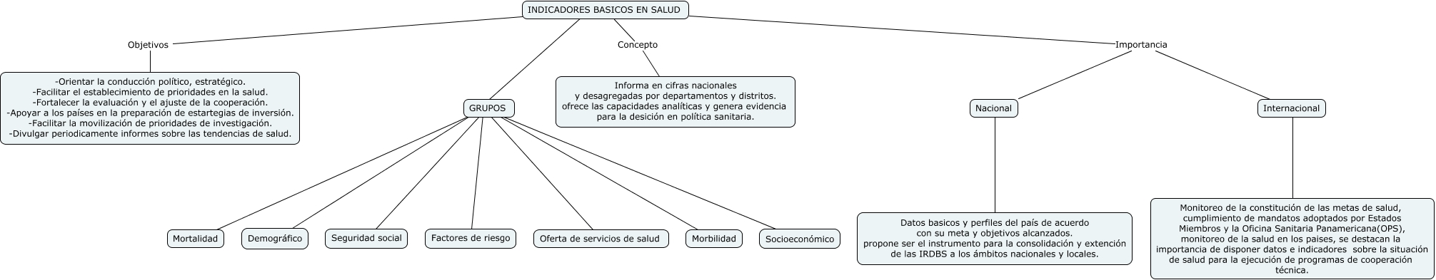Este Cmap, tiene información relacionada con: Sin Título 1 IBS, INDICADORES BASICOS EN SALUD Importancia Nacional, INDICADORES BASICOS EN SALUD Concepto Informa en cifras nacionales y desagregadas por departamentos y distritos. ofrece las capacidades analíticas y genera evidencia para la desición en política sanitaria., GRUPOS ???? Factores de riesgo, GRUPOS ???? Socioeconómico, GRUPOS ???? Seguridad social, GRUPOS ???? Oferta de servicios de salud, GRUPOS ???? Morbilidad, INDICADORES BASICOS EN SALUD ???? GRUPOS, Internacional ???? Monitoreo de la constitución de las metas de salud, cumplimiento de mandatos adoptados por Estados Miembros y la Oficina Sanitaria Panamericana(OPS), monitoreo de la salud en los paises, se destacan la importancia de disponer datos e indicadores sobre la situación de salud para la ejecución de programas de cooperación técnica., INDICADORES BASICOS EN SALUD Importancia Internacional, GRUPOS ???? Demográfico, Nacional ???? Datos basicos y perfiles del país de acuerdo con su meta y objetivos alcanzados. propone ser el instrumento para la consolidación y extención de las IRDBS a los ámbitos nacionales y locales., INDICADORES BASICOS EN SALUD Objetivos -Orientar la conducción político, estratégico. -Facilitar el establecimiento de prioridades en la salud. -Fortalecer la evaluación y el ajuste de la cooperación. -Apoyar a los países en la preparación de estartegias de inversión. -Facilitar la movilización de prioridades de investigación. -Divulgar periodicamente informes sobre las tendencias de salud., GRUPOS ???? Mortalidad