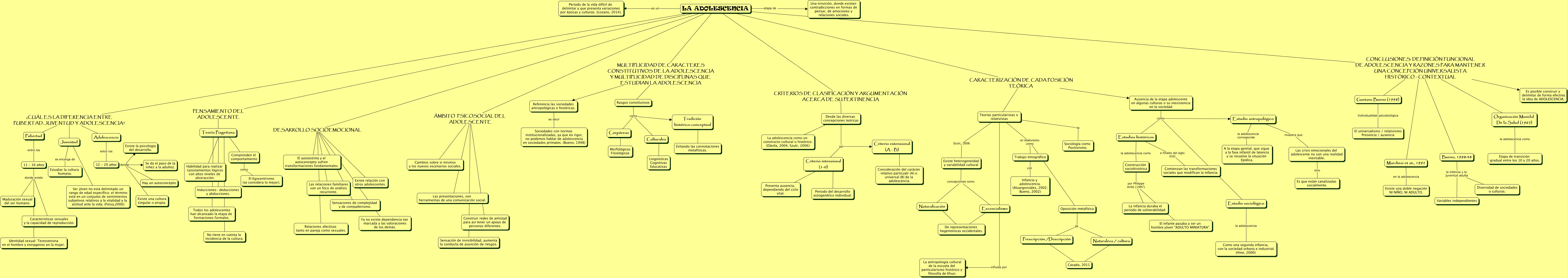 Este Cmap, tiene información relacionada con: LA ADOLESCENCIA, Criterio intensional (1-0) ???? Presenta ausencia, dependiendo del ciclo vital., Bueno, 1998:48 la infancia y la juventud adulta Variables independientes, Teorías particularistas o relativistas el relativismo como Oposición metafísica, LA ADOLESCENCIA ÁMBITO PSICOSOCIAL DEL ADOLESCENTE Cambios sobre si mismos y los nuevos escenarios sociales., Marchesi et at., 1992 en la adolescencia Existe una doble negación NI NIÑO, NI ADULTO., LA ADOLESCENCIA PENSAMIENTO DEL ADOLESCENTE Teoría Piagetiana, LA ADOLESCENCIA ¿CUÁL ES LA DIFERENCIA ENTRE PUBERTAD, JUVENTUD Y ADOLESCENCIA? Juventud, Desde las diversas concepciones teóricas así Criterio extensional (A - B), Construcción sociohistórica por Philippe Ariés (1987) El infante pasaba a ser un hombre jóven "ADULTO MINIATURA"., Estudios históricos a finales del siglo XVII Comienzan las transformaciones sociales que modifican la infancia., LA ADOLESCENCIA CONCLUSIONES: DEFINICIÓN FUNCIONAL DE ADOLESCENCIA Y RAZONES PARA MANTENER UNA CONCEPCIÓN UNIVERSALISTA HISTÓRICO - CONTEXTUAL Marchesi et at., 1992, 11 - 16 años donde existe Maduración sexual del ser humano., Estudio antropológico la adolescencia corresponde A la etapa genital, que sigue a la fase infantil de latencia y se resuelve la situación Epídica., LA ADOLESCENCIA CONCLUSIONES: DEFINICIÓN FUNCIONAL DE ADOLESCENCIA Y RAZONES PARA MANTENER UNA CONCEPCIÓN UNIVERSALISTA HISTÓRICO - CONTEXTUAL Es posible construir y delimitar de forma efectiva la idea de ADOLESCENCIA., Casado, 2011 ???? Prescripción /Descripción, LA ADOLESCENCIA CONCLUSIONES: DEFINICIÓN FUNCIONAL DE ADOLESCENCIA Y RAZONES PARA MANTENER UNA CONCEPCIÓN UNIVERSALISTA HISTÓRICO - CONTEXTUAL Gustavo Bueno (1998), Corpóreas ???? Morfológicas Fisiológicas, Oposición metafísica de Prescripción /Descripción, LA ADOLESCENCIA es un Periodo de la vida difícil de delimitar y que presenta variaciones por épocas y culturas. (Lozano, 2014)., 11 - 16 años donde existe Identidad sexual: Testosterona en el hombre y estrpgenos en la mujer.