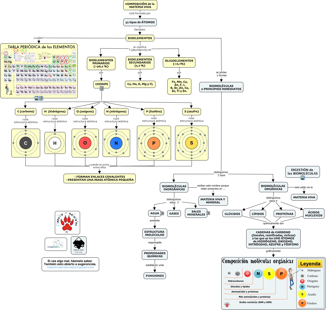 Este Cmap, tiene información relacionada con: Tema 06.02 Bioelementos y biomoléculas, CHONPS i.e S (azufre), BIOMOLÉCULAS ORGÁNICAS distinguimos estos 4 ÁCIDOS NUCLEICOS, OLIGOELEMENTOS (ɘ,1%) son Fe, Mn, Cu, Zn, F, I, B, Br, Zn, Co, Se, Ti y Sn., ESTRUCTURA MOLECULAR responsable PROPIEDADES QUÍMICAS, AGUA presenta ESTRUCTURA MOLECULAR, BIOMOLÉCULAS INORGÁNICAS distinguimos estos 3 AGUA, 52 tipos de ÁTOMOS llamados BIOELEMENTOS, PROTEÍNAS químicamente son CADENAS de CARBONO (lineales, ramificadas, cíclicas) a las que se les UNE ÁTOMOS de HIDRÓGENO, OXÍGENO, NITRÓGENO, AZUFRE y FÓSFORO, BIOELEMENTOS se clasifica f (abundancia) en OLIGOELEMENTOS (ɘ,1%), cuando se junta entre ellos - FORMAN ENLACES COVALENTES - PRESENTAN UNA MASA ATÓMICA PEQUEÑA, C (carbono) cuya estructura atómica, cuando se junta entre ellos - FORMAN ENLACES COVALENTES - PRESENTAN UNA MASA ATÓMICA PEQUEÑA, BIOMOLÉCULAS ORGÁNICAS distinguimos estos 4 GLÚCIDOS, BIOELEMENTOS SECUNDARIOS (2,7 %) son Ca, Na, K, Mg y Cl,, CHONPS i.e O (oxígeno), CHONPS i.e H (hidrógeno), O (oxígeno) cuya estructura atómica, ÁCIDOS NUCLEICOS químicamente son CADENAS de CARBONO (lineales, ramificadas, cíclicas) a las que se les UNE ÁTOMOS de HIDRÓGENO, OXÍGENO, NITRÓGENO, AZUFRE y FÓSFORO, BIOMOLÉCULAS o PRINCIPIOS INMEDIATOS distinguimos 2 tipos BIOMOLÉCULAS INORGÁNICAS, BIOMOLÉCULAS ORGÁNICAS distinguimos estos 4 PROTEÍNAS