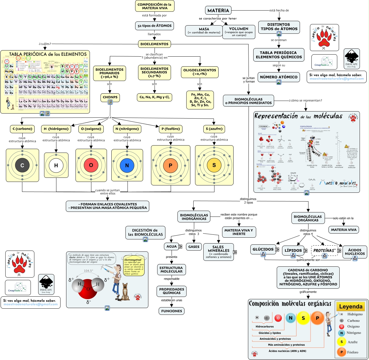 Este Cmap, tiene información relacionada con: Tema 04.02 Los seres vivos, BIOMOLÉCULAS ORGÁNICAS solo están en la MATERIA VIVA, HIDRÓGENO (H) en estas proporciones CnH2nOn, CARBONO (C) en estas proporciones CnH2nOn, GLÚCIDOS* están formados por CARBONO (C), TABLA PERIÓDICA ELEMENTOS QUÍMICOS según su NÚMERO ATÓMICO, OXÍGENO (O) en proporciones BAJAS, DISTINTOS TIPOS de ÁTOMOS se ordenan TABLA PERIÓDICA ELEMENTOS QUÍMICOS, 52 tipos de ÁTOMOS llamados BIOELEMENTOS, DISOLUCIONES (= disociadas en iones) e.g Na+, Cl-, CHONPS i.e C (carbono), ESTRUCTURA MOLECULAR responsable PROPIEDADES QUÍMICAS, BIOELEMENTOS PRIMARIOS (ᢘ,2 %) son CHONPS, cuando se juntan entre ellos - FORMAN ENLACES COVALENTES - PRESENTAN UNA MASA ATÓMICA PEQUEÑA, BIOMOLÉCULAS INORGÁNICAS distinguimos estos 3 GASES, cuando se juntan entre ellos - FORMAN ENLACES COVALENTES - PRESENTAN UNA MASA ATÓMICA PEQUEÑA, BIOELEMENTOS se clasifican f (abundancia) en OLIGOELEMENTOS (ɘ,1%), O (oxígeno) cuya estructura atómica, COMPOSICIÓN de la MATERIA VIVA está formada por 52 tipos de ÁTOMOS, AZUFRE (S) en proporciones MUY BAJAS, NITRÓGENO (N) en proporciones BAJAS (16 %)