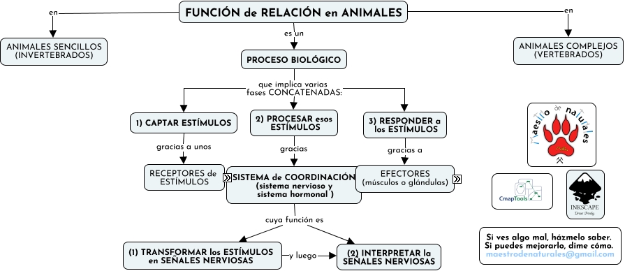 Este Cmap, tiene información relacionada con: Tema 06.06.03 Función RELACIÓN en el reino animal, CAPTAR ESTÍMULOS los cuales se clasifican en función TIPO de ESTÍMULO, LOS EFECTORES son los GLÁNDULAS, SISTEMA de COORDINACIÓN (sistema nervioso y sistema hormonal ) cuya función es (2) INTERPRETAR la SEÑALES NERVIOSAS, FUNCIÓN de RELACIÓN en ANIMALES en ANIMALES SENCILLOS (INVERTEBRADOS), 1) CAPTAR ESTÍMULOS gracias a unos RECEPTORES de ESTÍMULOS, SISTEMA de COORDINACIÓN (sistema nervioso y sistema hormonal ) cuya función es (1) TRANSFORMAR los ESTÍMULOS en SEÑALES NERVIOSAS, EXTERORRECEPTORES - provienen fuera del animal- por ejemplo TACTO, GLÁNDULAS pueden ser ENDOCRINAS, ÓRGANOS RECEPTORES cuya función es CAPTAR ESTÍMULOS, (1) TRANSFORMAR los ESTÍMULOS en SEÑALES NERVIOSAS y luego (2) INTERPRETAR la SEÑALES NERVIOSAS, MEMBRANA PLASMÁTICA de la CÉLULA DIANA desencadena REACCIONES QUÍMICAS INTRACELULARES, CAPTAR ESTÍMULOS los cuales se clasifican en función PROCEDENCIA del ESTÍMULO, TIPO de ESTÍMULO distinguimos MECANORRECEPTORES -Iinforman sobre variaciones de presión, roce, sonido, gravedad, etc-, PROCESO BIOLÓGICO que implica varias fases CONCATENADAS: 3) RESPONDER a los ESTÍMULOS, TIPO de ESTÍMULO distinguimos TERMORRECEPTORES -Iinforman sobre variaciones de temperatura-, HORMONAS (= moléculas orgánicas del sistema endocrino) que al llegar MEMBRANA PLASMÁTICA de la CÉLULA DIANA, MÚSCULOS que al CONTRAERSE/RELAJARSE cuando recibe un IMPULSO NERVIOSO, ENDOCRINAS por ejemplo NEUROTRANSMISORES (= moléculas orgánicas del sistema nervioso), 1 ó VARIAS CÉLULAS ESPECIALIZADAS cuya función es CAPTAR ESTÍMULOS, FUNCIÓN de RELACIÓN en ANIMALES es un PROCESO BIOLÓGICO