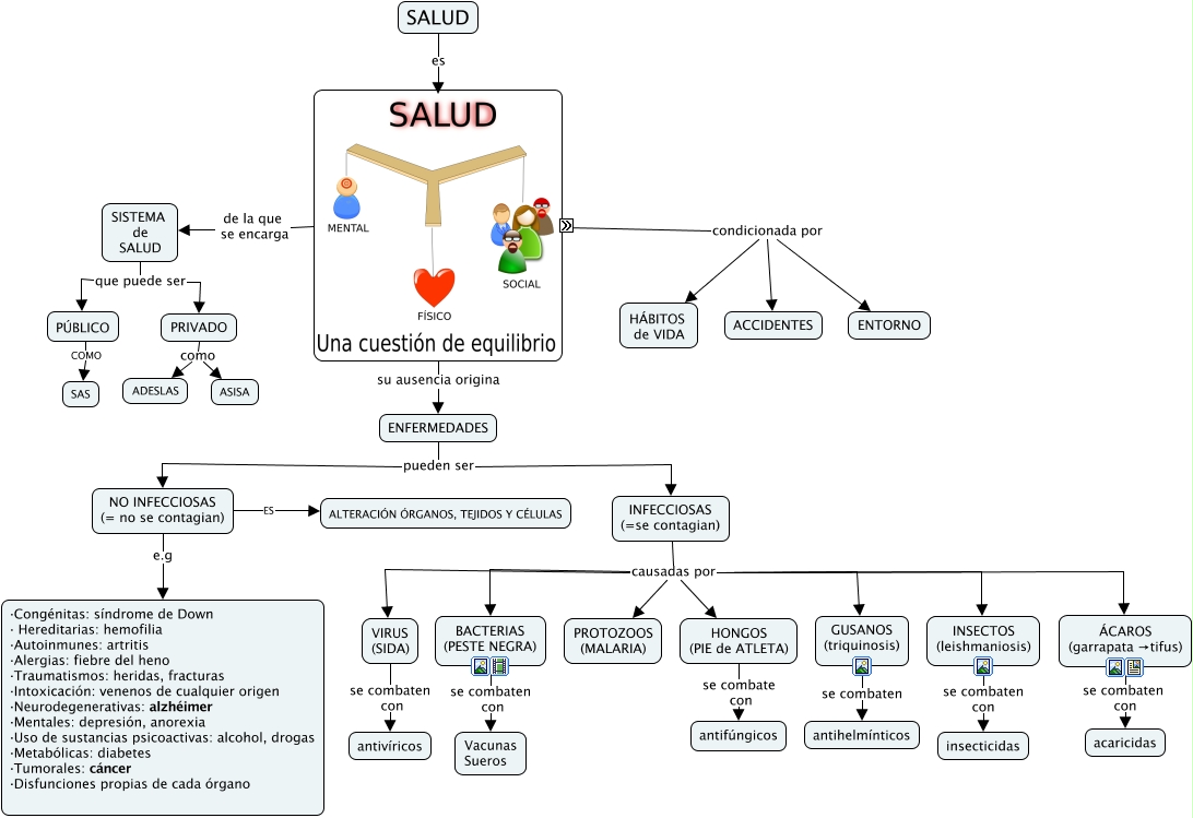 Este Cmap, tiene información relacionada con: Salud y enfermedad Resumen del tema, INFECCIOSAS (=se contagian) causadas por BACTERIAS (PESTE NEGRA), INSECTOS (leishmaniosis) se combaten con insecticidas, ESTADO COMPLETO BIENESTAR formado por la triada SOCIAL, condicionada por ENTORNO, de la que se encarga SISTEMA de SALUD, condicionada por ACCIDENTES, NO INFECCIOSAS (= no se contagian) e.g ·Congénitas: síndrome de Down · Hereditarias: hemofilia ·Autoinmunes: artritis ·Alergias: fiebre del heno ·Traumatismos: heridas, fracturas ·Intoxicación: venenos de cualquier origen ·Neurodegenerativas: alzhéimer ·Mentales: depresión, anorexia ·Uso de sustancias psicoactivas: alcohol, drogas ·Metabólicas: diabetes ·Tumorales: cáncer ·Disfunciones propias de cada órgano, ENFERMEDADES pueden ser NO INFECCIOSAS (= no se contagian), INFECCIOSAS (=se contagian) causadas por GUSANOS (triquinosis), su ausencia origina ENFERMEDADES, PÚBLICO COMO SAS, INFECCIOSAS (=se contagian) causadas por ÁCAROS (garrapata →tifus), INFECCIOSAS (=se contagian) causadas por INSECTOS (leishmaniosis), ESTADO COMPLETO BIENESTAR formado por la triada BIESTAR FÍSICO, ENFERMEDADES pueden ser INFECCIOSAS (=se contagian), SISTEMA de SALUD que puede ser PÚBLICO, VIRUS (SIDA) se combaten con antivíricos, GUSANOS (triquinosis) se combaten antihelmínticos, INFECCIOSAS (=se contagian) causadas por HONGOS (PIE de ATLETA), PRIVADO como ADESLAS