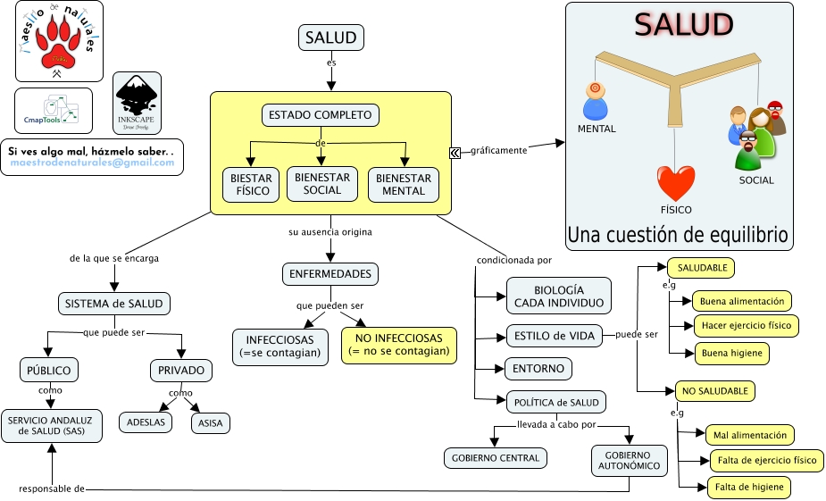 Este Cmap, tiene información relacionada con: Tema 02.01 Qué es la salud, SISTEMA de SALUD que puede ser PÚBLICO, su ausencia origina ENFERMEDADES, NO SALUDABLE e.g Falta de ejercicio físico, SISTEMA de SALUD que puede ser PRIVADO, GOBIERNO AUTONÓMICO responsable de SERVICIO ANDALUZ de SALUD (SAS), ESTADO COMPLETO de BIESTAR FÍSICO, SALUDABLE e.g Buena higiene, de la que se encarga SISTEMA de SALUD, condicionada por ESTILO de VIDA, ESTILO de VIDA puede ser NO SALUDABLE, SALUD es, PRIVADO como ASISA, ENFERMEDADES que pueden ser INFECCIOSAS (=se contagian), POLÍTICA de SALUD llevada a cabo por GOBIERNO CENTRAL, POLÍTICA de SALUD llevada a cabo por GOBIERNO AUTONÓMICO, ESTILO de VIDA puede ser SALUDABLE, gráficamente, PÚBLICO como SERVICIO ANDALUZ de SALUD (SAS), PRIVADO como ADESLAS, NO SALUDABLE e.g Falta de higiene