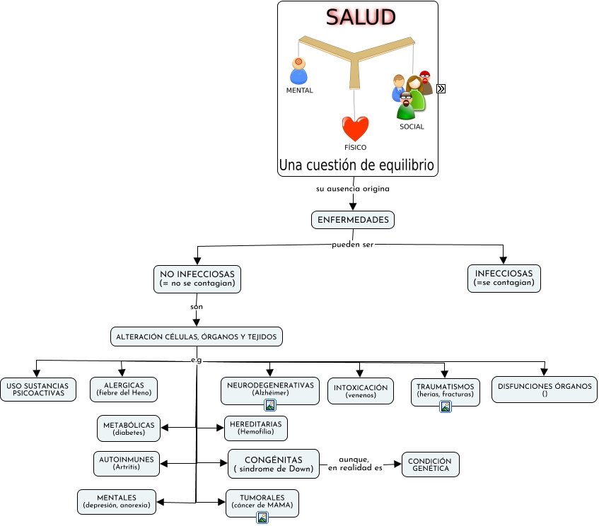 Este Cmap, tiene información relacionada con: Tema 02.02.02 Enfermedades no infecciosas, ALTERACIÓN CÉLULAS, ÓRGANOS Y TEJIDOS e.g CONGÉNITAS ( síndrome de Down), ALTERACIÓN CÉLULAS, ÓRGANOS Y TEJIDOS e.g METABÓLICAS (diabetes), ALTERACIÓN CÉLULAS, ÓRGANOS Y TEJIDOS e.g USO SUSTANCIAS PSICOACTIVAS, ESTADO COMPLETO BIENESTAR formado por la triada SOCIAL, ALTERACIÓN CÉLULAS, ÓRGANOS Y TEJIDOS e.g INTOXICACIÓN (venenos), ENFERMEDADES pueden ser INFECCIOSAS (=se contagian), ALTERACIÓN CÉLULAS, ÓRGANOS Y TEJIDOS e.g NEURODEGENERATIVAS (Alzhéimer), ESTADO COMPLETO BIENESTAR formado por la triada BIESTAR FÍSICO, ALTERACIÓN CÉLULAS, ÓRGANOS Y TEJIDOS e.g AUTOINMUNES (Artritis), NO INFECCIOSAS (= no se contagian) son ALTERACIÓN CÉLULAS, ÓRGANOS Y TEJIDOS, ENFERMEDADES pueden ser NO INFECCIOSAS (= no se contagian), ALTERACIÓN CÉLULAS, ÓRGANOS Y TEJIDOS e.g DISFUNCIONES ÓRGANOS (), ESTADO COMPLETO BIENESTAR formado por la triada BIENESTAR MENTAL, ALTERACIÓN CÉLULAS, ÓRGANOS Y TEJIDOS e.g ALERGICAS (fiebre del Heno), ALTERACIÓN CÉLULAS, ÓRGANOS Y TEJIDOS e.g HEREDITARIAS (Hemofilia), ALTERACIÓN CÉLULAS, ÓRGANOS Y TEJIDOS e.g MENTALES (depresión, anorexia), CONGÉNITAS ( síndrome de Down) aunque, en realidad es CONDICIÓN GENÉTICA, ALTERACIÓN CÉLULAS, ÓRGANOS Y TEJIDOS e.g TUMORALES (cáncer de MAMA), su ausencia origina ENFERMEDADES, ALTERACIÓN CÉLULAS, ÓRGANOS Y TEJIDOS e.g TRAUMATISMOS (herias, fracturas)