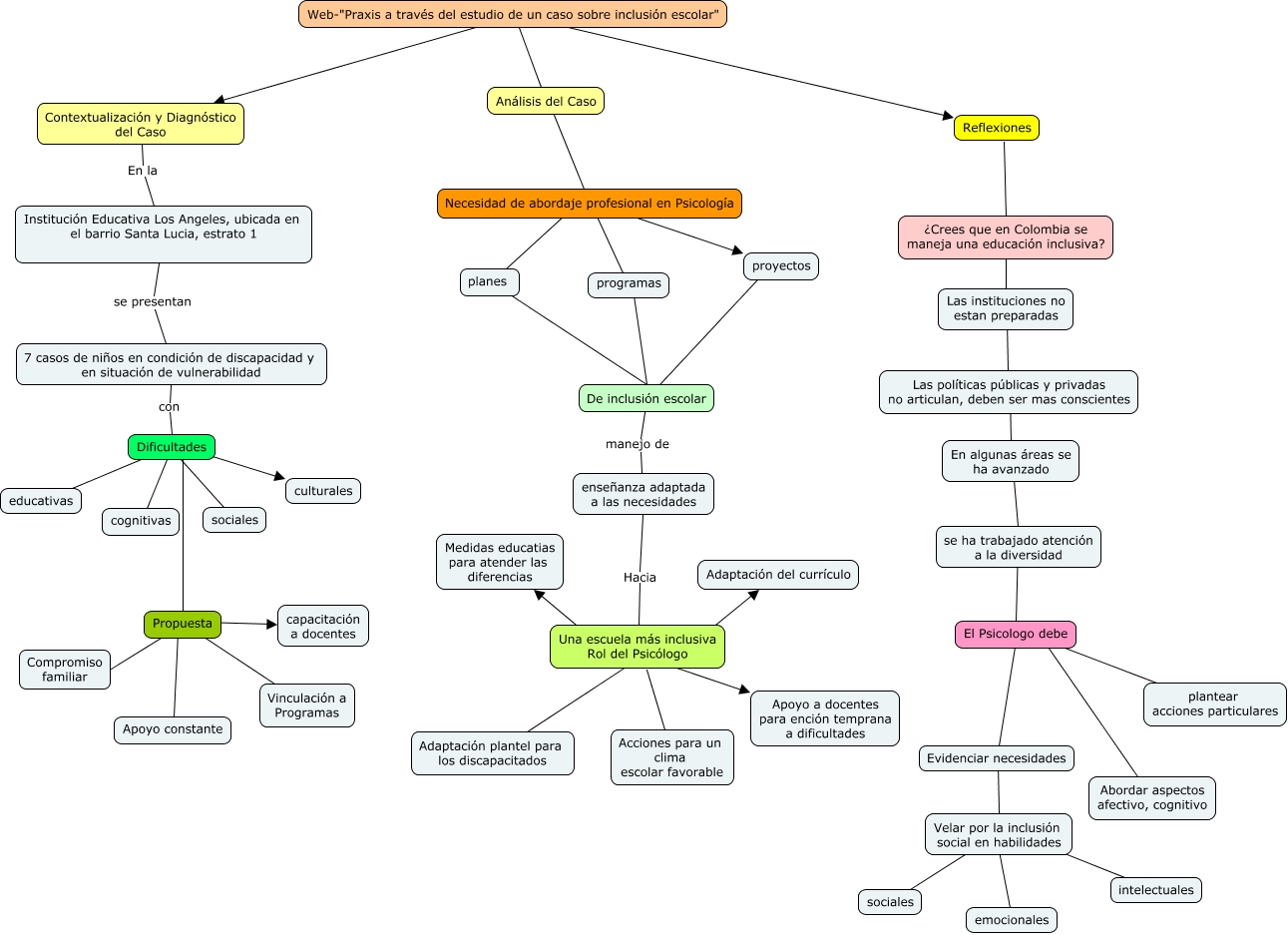 Este Cmap, tiene información relacionada con: Acción psicosocial y educación-Praxis a través del estudiode un caso sobre inclusión escolar, Una escuela más inclusiva Rol del Psicólogo ???? Adaptación del currículo, De inclusión escolar manejo de enseñanza adaptada a las necesidades, El Psicologo debe ???? Evidenciar necesidades, Evidenciar necesidades ???? Velar por la inclusión social en habilidades, Propuesta ???? Vinculación a Programas, 7 casos de niños en condición de discapacidad y en situación de vulnerabilidad con Dificultades, Necesidad de abordaje profesional en Psicología ???? proyectos, Reflexiones ???? ¿Crees que en Colombia se maneja una educación inclusiva?, En algunas áreas se ha avanzado ???? se ha trabajado atención a la diversidad, Dificultades ???? Propuesta, Velar por la inclusión social en habilidades ???? sociales, Institución Educativa Los Angeles, ubicada en el barrio Santa Lucia, estrato 1 se presentan 7 casos de niños en condición de discapacidad y en situación de vulnerabilidad, enseñanza adaptada a las necesidades Hacia Una escuela más inclusiva Rol del Psicólogo, Análisis del Caso ???? Necesidad de abordaje profesional en Psicología, Web-"Praxis a través del estudio de un caso sobre inclusión escolar" ???? Contextualización y Diagnóstico del Caso, Web-"Praxis a través del estudio de un caso sobre inclusión escolar" ???? Reflexiones, Una escuela más inclusiva Rol del Psicólogo ???? Adaptación plantel para los discapacitados, El Psicologo debe Debe plantear acciones particulares, proyectos ???? De inclusión escolar, Dificultades ???? sociales
