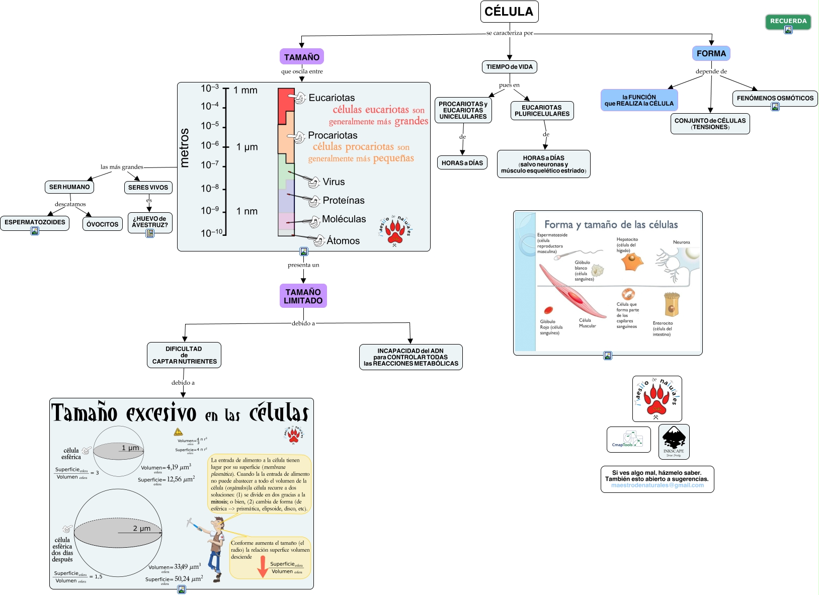 Este Cmap, tiene información relacionada con: Tema 05.01.01 Tamaño, forma y tiempo de vida de la célula, CÉLULA se caracteriza por TIEMPO de VIDA, DIFICULTAD de CAPTAR NUTRIENTES debido a, TAMAÑO LIMITADO debido a INCAPACIDAD del ADN para CONTROLAR TODAS las REACCIONES METABÓLICAS, TAMAÑO que oscila entre, FORMA depende de la FUNCIÓN que REALIZA la CÉLULA, las más grandes SERES VIVOS, EUCARIOTAS PLURICELULARES de HORAS a DÍAS (salvo neuronas y músculo esquelético estriado), SER HUMANO descatamos ESPERMATOZOIDES, TAMAÑO LIMITADO debido a DIFICULTAD de CAPTAR NUTRIENTES, FORMA depende de FENÓMENOS OSMÓTICOS, TIEMPO de VIDA pues en PROCARIOTAS y EUCARIOTAS UNICELULARES, FORMA depende de CONJUNTO de CÉLULAS (TENSIONES), las más grandes SER HUMANO, CÉLULA se caracteriza por TAMAÑO, SER HUMANO descatamos ÓVOCITOS, SERES VIVOS es ¿HUEVO de AVESTRUZ?, presenta un TAMAÑO LIMITADO, CÉLULA se caracteriza por FORMA, TIEMPO de VIDA pues en EUCARIOTAS PLURICELULARES, PROCARIOTAS y EUCARIOTAS UNICELULARES de HORAS a DÍAS