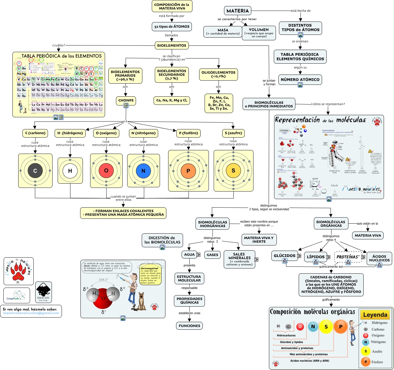Este Cmap, tiene información relacionada con: Tema 01.01 Composición química de los seres vivos, cuando se juntan entre ellos - FORMAN ENLACES COVALENTES - PRESENTAN UNA MASA ATÓMICA PEQUEÑA, PROTEÍNAS compuestas por los siguientes bioelementos OXÍGENO (O), cuando se juntan entre ellos - FORMAN ENLACES COVALENTES - PRESENTAN UNA MASA ATÓMICA PEQUEÑA, PROTEÍNAS compuestas por los siguientes bioelementos FÓSFORO (P), HIERRO (Fe), COBRE (Cu), MAGNESIO (Mg), IODO (I), DISOLUCIONES (= disociadas en iones) e.g Na+, Cl-, H (hidrógeno) cuya estructura atómica, CHONPS i.e S (azufre), BIOMOLÉCULAS ORGÁNICAS distinguimos estos 4 PROTEÍNAS*, O (oxígeno) cuya estructura atómica, BIOMOLÉCULAS INORGÁNICAS distinguimos estos 3 GASES, PROPIEDADES QUÍMICAS establecen unas FUNCIONES, BIOELEMENTOS ¿cuáles?, OXÍGENO (O) en proporciones ALTAS, BIOMOLÉCULAS ORGÁNICAS solo están en la MATERIA VIVA, DISTINTOS TIPOS de ÁTOMOS se ordenan TABLA PERIÓDICA ELEMENTOS QUÍMICOS, PROTEÍNAS compuestas por los siguientes bioelementos AZUFRE (S), S (azufre) cuya estructura atómica, BIOMOLÉCULAS INORGÁNICAS distinguimos estos 3 AGUA, CnH2nOn por lo que reciben el nombre de HIDRATOS de CARBONO, GLÚCIDOS químicamente son CADENAS de CARBONO (lineales, ramificadas, cíclicas) a las que se les UNE ÁTOMOS de HIDRÓGENO, OXÍGENO, NITRÓGENO, AZUFRE y FÓSFORO