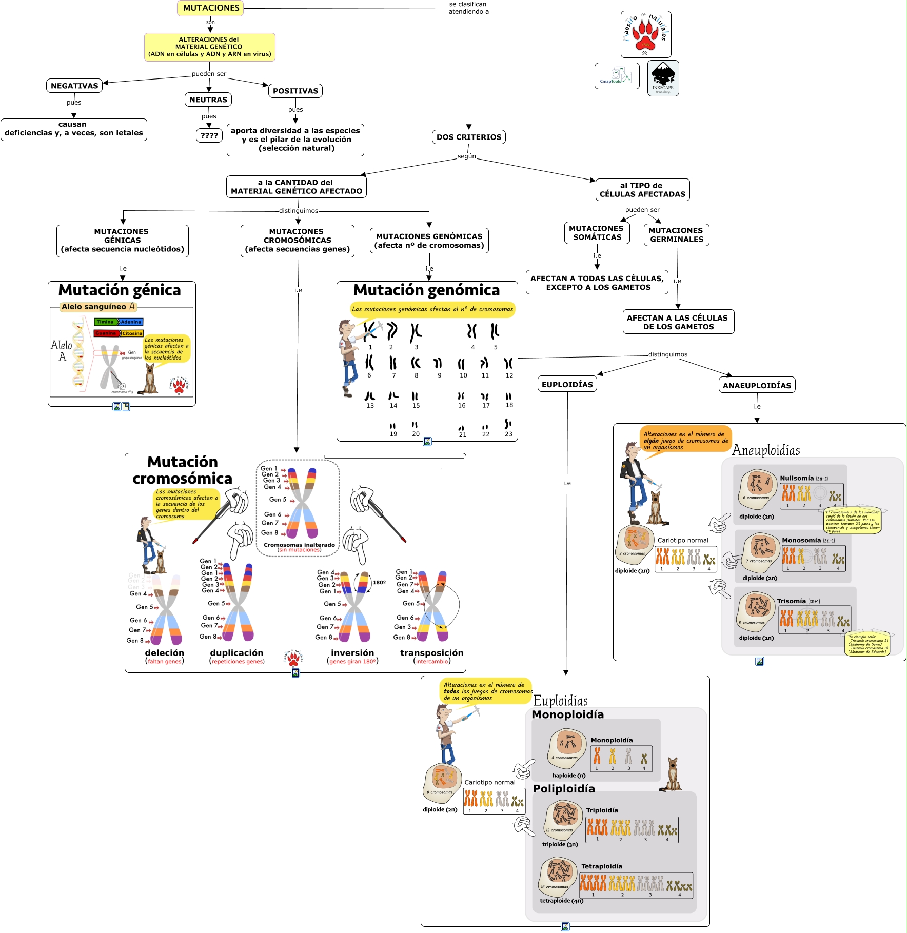 Este Cmap, tiene información relacionada con: Tema 4.1 Qué es la mutación y tipos de mutación, ALTERACIONES del MATERIAL GENÉTICO (ADN en células y ADN y ARN en virus) pueden ser NEUTRAS, a la CANTIDAD del MATERIAL GENÉTICO AFECTADO distinguimos MUTACIONES CROMOSÓMICAS (afecta secuencias genes), MUTACIONES son ALTERACIONES del MATERIAL GENÉTICO (ADN en células y ADN y ARN en virus), distinguimos EUPLOIDÍAS, POSITIVAS pues aporta diversidad a las especies y es el pilar de la evolución (selección natural), distinguimos ANAEUPLOIDÍAS, MUTACIONES CROMOSÓMICAS (afecta secuencias genes) i.e, MUTACIONES se clasifican atendiendo a DOS CRITERIOS, DOS CRITERIOS según a la CANTIDAD del MATERIAL GENÉTICO AFECTADO, EUPLOIDÍAS i.e, ALTERACIONES del MATERIAL GENÉTICO (ADN en células y ADN y ARN en virus) pueden ser NEGATIVAS, a la CANTIDAD del MATERIAL GENÉTICO AFECTADO distinguimos MUTACIONES GENÓMICAS (afecta nº de cromosomas), NEUTRAS pues ????, NEGATIVAS pues causan deficiencias y, a veces, son letales, MUTACIONES GÉNICAS (afecta secuencia nucleótidos) i.e, MUTACIONES GERMINALES i.e AFECTAN A LAS CÉLULAS DE LOS GAMETOS, al TIPO de CÉLULAS AFECTADAS pueden ser MUTACIONES SOMÁTICAS, MUTACIONES GENÓMICAS (afecta nº de cromosomas) i.e, a la CANTIDAD del MATERIAL GENÉTICO AFECTADO distinguimos MUTACIONES GÉNICAS (afecta secuencia nucleótidos), ANAEUPLOIDÍAS i.e