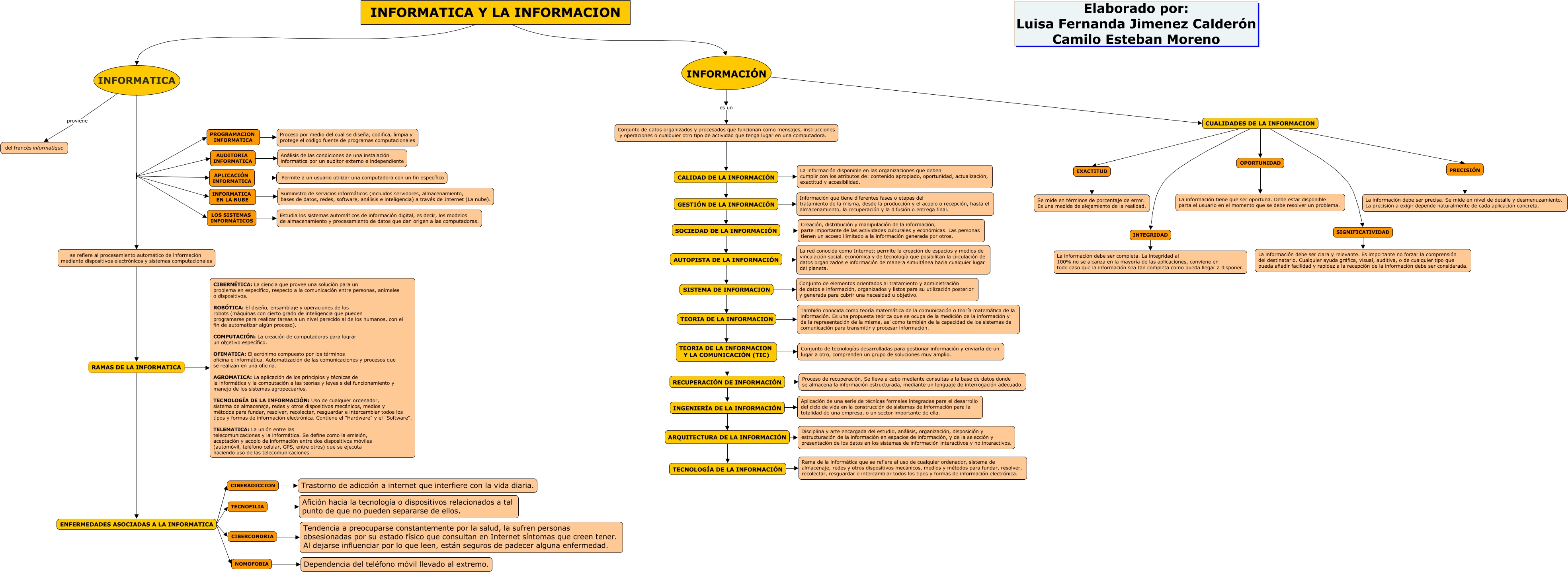 Este Cmap, tiene información relacionada con: Luisa y Camilo, INFORMATICA proviene del francés informatique, SOCIEDAD DE LA INFORMACIÓN AUTOPISTA DE LA INFORMACIÓN, Conjunto de datos organizados y procesados que funcionan como mensajes, instrucciones y operaciones o cualquier otro tipo de actividad que tenga lugar en una computadora. CALIDAD DE LA INFORMACIÓN, INFORMACIÓN es un Conjunto de datos organizados y procesados que funcionan como mensajes, instrucciones y operaciones o cualquier otro tipo de actividad que tenga lugar en una computadora., INFORMATICA PROGRAMACION INFORMATICA, RECUPERACIÓN DE INFORMACIÓN INGENIERÍA DE LA INFORMACIÓN, CALIDAD DE LA INFORMACIÓN GESTIÓN DE LA INFORMACIÓN, PRECISIÓN La información debe ser precisa. Se mide en nivel de detalle y desmenuzamiento. La precisión a exigir depende naturalmente de cada aplicación concreta., RAMAS DE LA INFORMATICA ENFERMEDADES ASOCIADAS A LA INFORMATICA, TEORIA DE LA INFORMACION TEORIA DE LA INFORMACION Y LA COMUNICACIÓN (TIC), CUALIDADES DE LA INFORMACION INTEGRIDAD, INFORMATICA EN LA NUBE Suministro de servicios informáticos (incluidos servidores, almacenamiento, bases de datos, redes, software, análisis e inteligencia) a través de Internet (La nube)., TECNOLOGÍA DE LA INFORMACIÓN Rama de la informática que se refiere al uso de cualquier ordenador, sistema de almacenaje, redes y otros dispositivos mecánicos, medios y métodos para fundar, resolver, recolectar, resguardar e intercambiar todos los tipos y formas de información electrónica., AUTOPISTA DE LA INFORMACIÓN La red conocida como Internet; permite la creación de espacios y medios de vinculación social, económica y de tecnología que posibilitan la circulación de datos organizados e información de manera simultánea hacia cualquier lugar del planeta., RAMAS DE LA INFORMATICA CIBERNÉTICA: La ciencia que provee una solución para un problema en específico, respecto a la comunicación entre personas, animales o dispositivos. ROBÓTICA: El diseño, ensamblaje y operaciones de los robots (máquinas con cierto grado de inteligencia que pueden programarse para realizar tareas a un nivel parecido al de los humanos, con el fin de automatizar algún proceso). COMPUTACIÓN: La creación de computadoras para lograr un objetivo específico. OFIMATICA: El acrónimo compuesto por los términos oficina e informática. Automatización de las comunicaciones y procesos que se realizan en una oficina. AGROMATICA: La aplicación de los principios y técnicas de la informática y la computación a las teorías y leyes s del funcionamiento y manejo de los sistemas agropecuarios. TECNOLOGÍA DE LA INFORMACIÓN: Uso de cualquier ordenador, sistema de almacenaje, redes y otros dispositivos mecánicos, medios y métodos para fundar, resolver, recolectar, resguardar e intercambiar todos los tipos y formas de información electrónica. Contiene el "Hardware" y el "Software". TELEMATICA: La unión entre las telecomunicaciones y la informática. Se define como la emisión, aceptación y acopio de información entre dos dispositivos móviles (automóvil, teléfono celular, GPS, entre otros) que se ejecuta haciendo uso de las telecomunicaciones., SIGNIFICATIVIDAD La información debe ser clara y relevante. Es importante no forzar la comprensión del destinatario. Cualquier ayuda gráfica, visual, auditiva, o de cualquier tipo que pueda añadir facilidad y rapidez a la recepción de la información debe ser considerada., TEORIA DE LA INFORMACION También conocida como teoría matemática de la comunicación o teoría matemática de la información. Es una propuesta teórica que se ocupa de la medición de la información y de la representación de la misma, así como también de la capacidad de los sistemas de comunicación para transmitir y procesar información., CUALIDADES DE LA INFORMACION PRECISIÓN, SISTEMA DE INFORMACION Conjunto de elementos orientados al tratamiento y administración de datos e información, organizados y listos para su utilización posterior y generada para cubrir una necesidad u objetivo., ENFERMEDADES ASOCIADAS A LA INFORMATICA CIBERCONDRIA