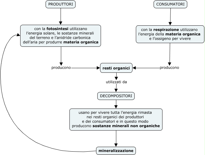 Questa Cmap, creata con IHMC CmapTools, contiene informazioni relative a: decompositori, mineralizzazione con la fotosintesi utilizzano l’energia solare, le sostanze minerali del terreno e l’anidride carbonica dell’aria per produrre materia organica, CONSUMATORI con la respirazione utilizzano l’energia della materia organica e l’ossigeno per vivere, con la fotosintesi utilizzano l’energia solare, le sostanze minerali del terreno e l’anidride carbonica dell’aria per produrre materia organica producono resti organici, usano per vivere tutta l’energia rimasta nei resti organici dei produttori e dei consumatori e in questo modo producono sostanze minerali non organiche mineralizzazione, DECOMPOSITORI usano per vivere tutta l’energia rimasta nei resti organici dei produttori e dei consumatori e in questo modo producono sostanze minerali non organiche, resti organici utilizzati da DECOMPOSITORI, PRODUTTORI con la fotosintesi utilizzano l’energia solare, le sostanze minerali del terreno e l’anidride carbonica dell’aria per produrre materia organica, con la respirazione utilizzano l’energia della materia organica e l’ossigeno per vivere producono resti organici