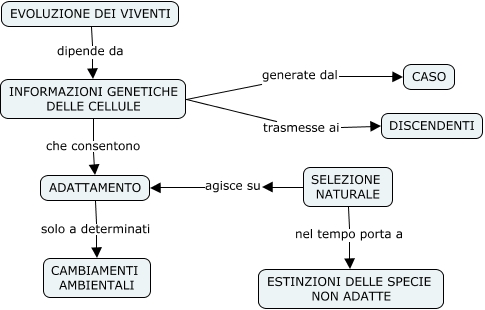 Questa Cmap, creata con IHMC CmapTools, contiene informazioni relative a: mappa evoluzione, EVOLUZIONE DEI VIVENTI dipende da INFORMAZIONI GENETICHE DELLE CELLULE, ADATTAMENTO solo a determinati CAMBIAMENTI AMBIENTALI, INFORMAZIONI GENETICHE DELLE CELLULE che consentono ADATTAMENTO, INFORMAZIONI GENETICHE DELLE CELLULE trasmesse ai DISCENDENTI, SELEZIONE NATURALE agisce su ADATTAMENTO, INFORMAZIONI GENETICHE DELLE CELLULE generate dal CASO, SELEZIONE NATURALE nel tempo porta a ESTINZIONI DELLE SPECIE NON ADATTE