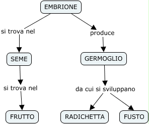 Questa Cmap, creata con IHMC CmapTools, contiene informazioni relative a: mappa embrione, EMBRIONE si trova nel SEME, GERMOGLIO da cui si sviluppano FUSTO, GERMOGLIO da cui si sviluppano RADICHETTA, SEME si trova nel FRUTTO, EMBRIONE produce GERMOGLIO