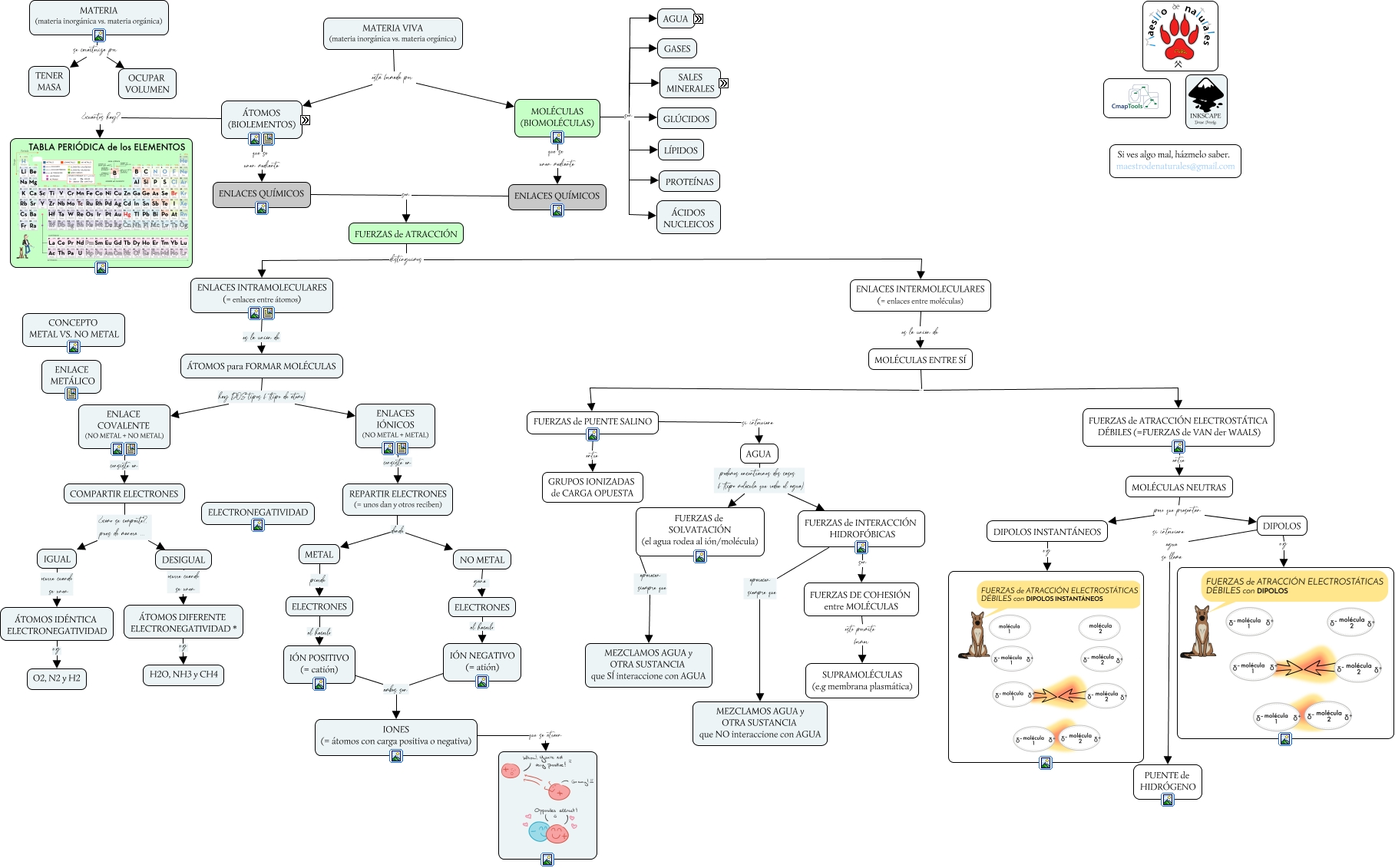 Este Cmap, tiene información relacionada con: 1.2 Los enlaces químicos, ENLACES QUÍMICOS son FUERZAS de ATRACCIÓN, MOLÉCULAS ENTRE SÍ - FUERZAS de ATRACCIÓN ELECTROSTÁTICA DÉBILES (=FUERZAS de VAN der WAALS), ELECTRONES al hacerlo IÓN POSITIVO (= catión), ÁTOMOS para FORMAR MOLÉCULAS hay DOS tipos f (tipo de átomo) ENLACES IÓNICOS (NO METAL + METAL), MOLÉCULAS (BIOMOLÉCULAS) son PROTEÍNAS, FUERZAS de PUENTE SALINO si interviene AGUA, MATERIA VIVA (materia inorgánica vs. materia orgánica) está formada por ÁTOMOS (BIOLEMENTOS), ELECTRONES al hacerlo IÓN NEGATIVO (= atión), REPARTIR ELECTRONES (= unos dan y otros reciben) donde METAL, SALES MINERALES se encuentran en DISOLUCIONES (disociadas en iones), DISOLUCIONES (disociadas en iones) e.g Na+, Cl-, DESIGUAL ocurre cuando se unen ÁTOMOS DIFERENTE ELECTRONEGATIVIDAD *, MATERIA (materia inorgánica vs. materia orgánica) se caracteriza por TENER MASA, DIPOLOS e.g, MOLÉCULAS NEUTRAS pero que presentan DIPOLOS INSTANTÁNEOS, COMPARTIR ELECTRONES ¿cómo se comparte?, pues de manera ... IGUAL, MOLÉCULAS (BIOMOLÉCULAS) son ÁCIDOS NUCLEICOS, ENLACES INTERMOLECULARES (= enlaces entre moléculas) es la unión de MOLÉCULAS ENTRE SÍ, FUERZAS de INTERACCIÓN HIDROFÓBICAS son FUERZAS DE COHESIÓN entre MOLÉCULAS, FUERZAS DE COHESIÓN entre MOLÉCULAS esto permite formar SUPRAMOLÉCULAS (e.g membrana plasmática)