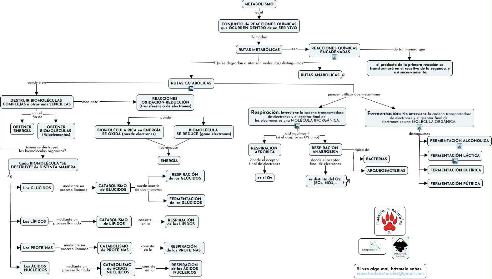 Este Cmap, tiene información relacionada con: Tema 08.02 Catabolismo, Los ÁCIDOS NUCLEICOS mediante un proceso llamado CATABOLISMO de ÁCIDOS NUCLIECOS, Los LÍPIDOS mediante un proceso llamado CATABOLISMO de LÍPIDOS, CONJUNTO de REACCIONES QUÍMICAS que OCURREN DENTRO de un SER VIVO llamadas RUTAS METABÓLICAS, RESPIRACIÓN AERÓBICA donde el aceptor final de electrones es el O2, CATABOLISMO de PROTEÍNAS consiste en la RESPIRACIÓN de las PROTEÍNAS, RUTAS METABÓLICAS f (si se degradan o sitetizan moléculas) distinguimos RUTAS ANABÓLICAS, Cada BIOMOLÉCULA "SE DESTRUYE" de DISTINTA MANERA e.g Los GLÚCIDOS, RUTAS METABÓLICAS f (si se degradan o sitetizan moléculas) distinguimos RUTAS CATABÓLICAS, Fermentación: No interviene la cadena transportadora de electrones y el aceptor final de electrones es una MOLÉCULA ORGÁNICA. distinguimos FERMENTACIÓN PÚTRIDA, RESPIRACIÓN ANAERÓBICA típico de ARQUEOBACTERIAS, Los PROTEÍNAS mediante un proceso llamado CATABOLISMO de PROTEÍNAS, DESTRUIR BIOMOLÉCULAS COMPLEJAS a otras más SENCILLAS mediante REACCIONES OXIDACIÓN-REDUCCIÓN (transferencia de electrones), CATABOLISMO de ÁCIDOS NUCLIECOS consiste en la RESPIRACIÓN de las ÁCIDOS NUCLEICOS, METABOLISMO es el CONJUNTO de REACCIONES QUÍMICAS que OCURREN DENTRO de un SER VIVO, RUTAS CATABÓLICAS consiste en DESTRUIR BIOMOLÉCULAS COMPLEJAS a otras más SENCILLAS, ANABOLISMO consiste en CONSTRUIR BIOMOLÉCULAS COMPLEJAS a partir de BIOMOLÉCULAS SENCILLAS, DESTRUIR BIOMOLÉCULAS COMPLEJAS a otras más SENCILLAS ¿cómo se destruyen las biomoléculas orgánicas? Cada BIOMOLÉCULA "SE DESTRUYE" de DISTINTA MANERA, CONSTRUIR BIOMOLÉCULAS COMPLEJAS a partir de BIOMOLÉCULAS SENCILLAS con el fin de OBTENER BIOMOLÉCULAS, Cada BIOMOLÉCULA "SE DESTRUYE" de DISTINTA MANERA e.g Los LÍPIDOS, Fermentación: No interviene la cadena transportadora de electrones y el aceptor final de electrones es una MOLÉCULA ORGÁNICA. distinguimos FERMENTACIÓN LÁCTICA