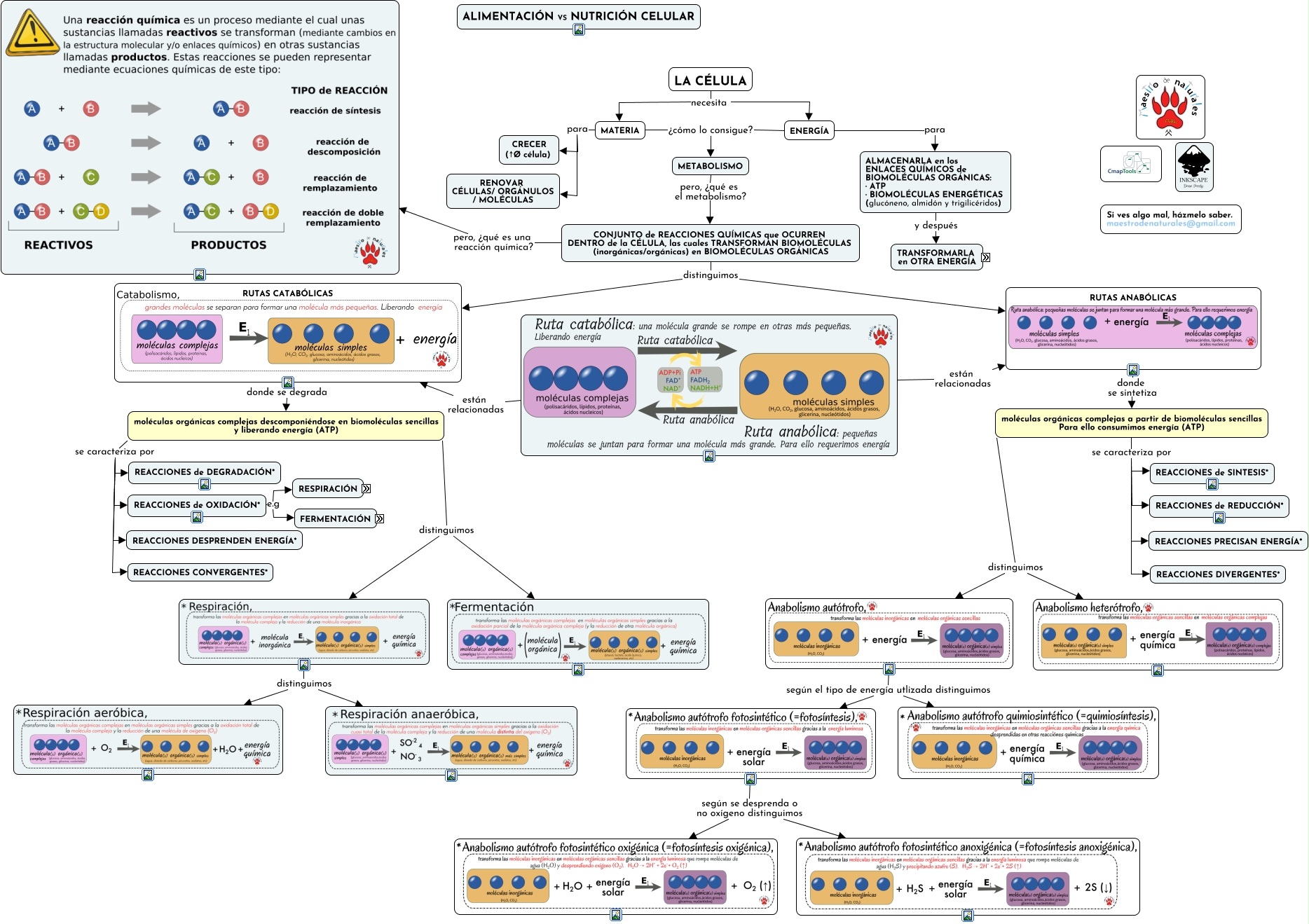 Este Cmap, tiene información relacionada con: Tema 08.01.00 Qué es el metabolismo, moléculas orgánicas complejas a partir de biomoléculas sencillas Para ello consumimos energía (ATP) distinguimos, según el tipo de energía utlizada distinguimos, distinguimos, moléculas orgánicas complejas a partir de biomoléculas sencillas Para ello consumimos energía (ATP) se caracteriza por REACCIONES DIVERGENTES*, MATERIA para RENOVAR CÉLULAS/ ORGÁNULOS / MOLÉCULAS, REACCIONES de OXIDACIÓN* e.g FERMENTACIÓN, moléculas orgánicas complejas a partir de biomoléculas sencillas Para ello consumimos energía (ATP) se caracteriza por REACCIONES PRECISAN ENERGÍA*, ENERGÍA QUÍMICA (almacenada en los enlaces químicos) se puede transformar en ENERGÍA CALORÍFICA (mantener tª constante del cuerpo), moléculas orgánicas complejas a partir de biomoléculas sencillas Para ello consumimos energía (ATP) se caracteriza por REACCIONES de REDUCCIÓN*, REACCIONES de OXIDACIÓN* e.g RESPIRACIÓN, RUTAS ANABÓLICAS donde se sintetiza moléculas orgánicas complejas a partir de biomoléculas sencillas Para ello consumimos energía (ATP), distinguimos, RESPIRACIÓN AERÓBICA donde el aceptor final de electrones es el O2, moléculas orgánicas complejas a partir de biomoléculas sencillas Para ello consumimos energía (ATP) distinguimos, CONJUNTO de REACCIONES QUÍMICAS que OCURREN DENTRO de la CÉLULA, las cuales TRANSFORMAN BIOMOLÉCULAS (inorgánicas/orgánicas) en BIOMOLÉCULAS ORGÁNICAS distinguimos RUTAS CATABÓLICAS, moléculas orgánicas complejas descomponiéndose en biomoléculas sencillas y liberando energía (ATP) distinguimos, MATERIA para CRECER (↑Ø célula), están relacionadas RUTAS CATABÓLICAS, MATERIA ¿cómo lo consigue? METABOLISMO, CONJUNTO de REACCIONES QUÍMICAS que OCURREN DENTRO de la CÉLULA, las cuales TRANSFORMAN BIOMOLÉCULAS (inorgánicas/orgánicas) en BIOMOLÉCULAS ORGÁNICAS pero, ¿qué es una reacción química?