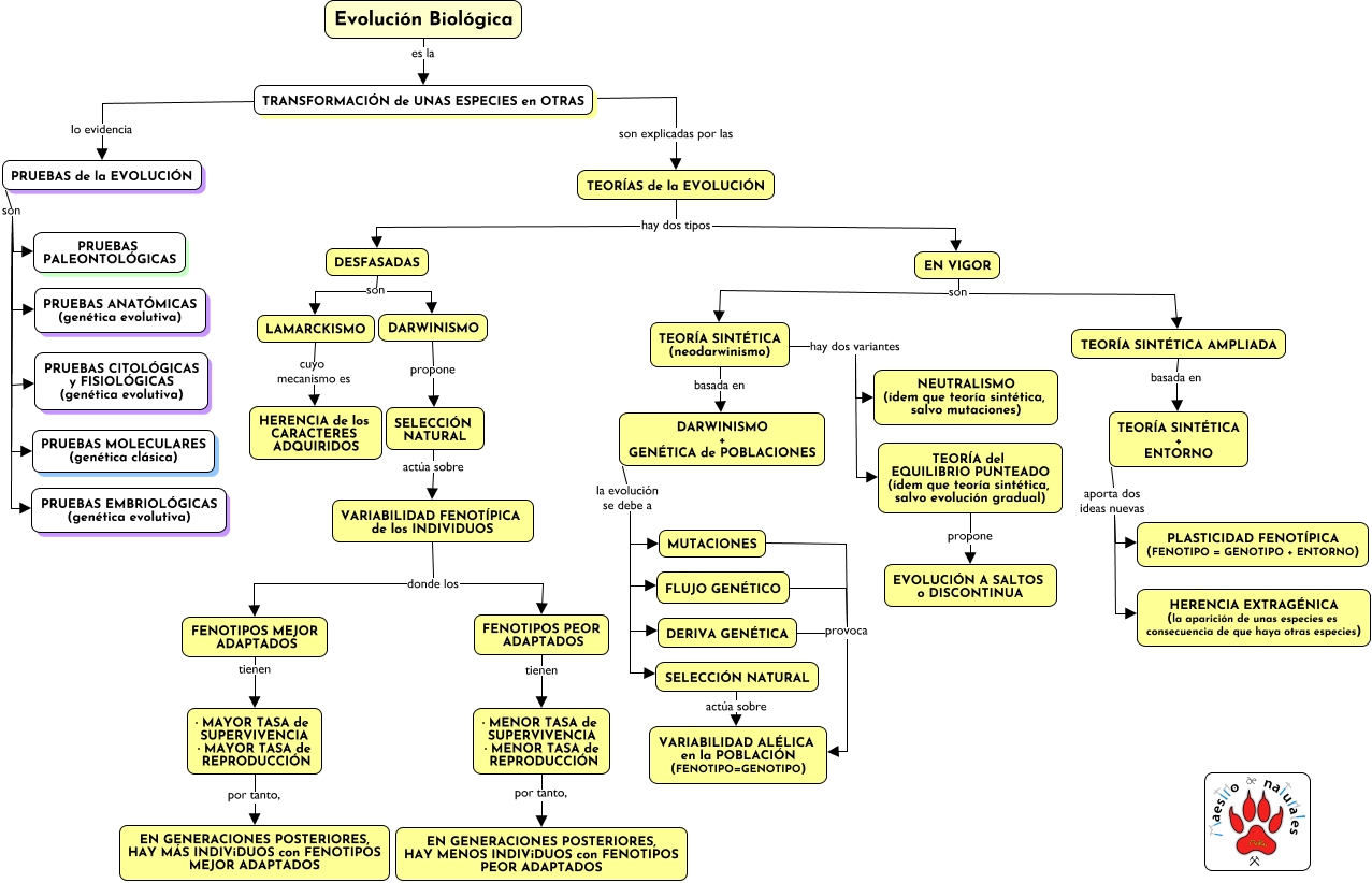 Este Cmap, tiene información relacionada con: Resumen Tema 16, TEORÍAS de la EVOLUCIÓN hay dos tipos DESFASADAS, DARWINISMO + GENÉTICA de POBLACIONES la evolución se debe a FLUJO GENÉTICO, TEORÍA SINTÉTICA + ENTORNO aporta dos ideas nuevas HERENCIA EXTRAGÉNICA (la aparición de unas especies es consecuencia de que haya otras especies), VARIABILIDAD FENOTÍPICA de los INDIVIDUOS donde los FENOTIPOS PEOR ADAPTADOS, TEORÍA del EQUILIBRIO PUNTEADO (ídem que teoría sintética, salvo evolución gradual) propone EVOLUCIÓN A SALTOS o DISCONTINUA, Evolución Biológica es la TRANSFORMACIÓN de UNAS ESPECIES en OTRAS, PRUEBAS de la EVOLUCIÓN son PRUEBAS EMBRIOLÓGICAS (genética evolutiva), TEORÍA SINTÉTICA (neodarwinismo) basada en DARWINISMO + GENÉTICA de POBLACIONES, · MENOR TASA de SUPERVIVENCIA · MENOR TASA de REPRODUCCIÓN por tanto, EN GENERACIONES POSTERIORES, HAY MENOS INDIViDUOS con FENOTIPOS PEOR ADAPTADOS, PRUEBAS de la EVOLUCIÓN son PRUEBAS PALEONTOLÓGICAS, FENOTIPOS PEOR ADAPTADOS tienen · MENOR TASA de SUPERVIVENCIA · MENOR TASA de REPRODUCCIÓN, DARWINISMO + GENÉTICA de POBLACIONES la evolución se debe a MUTACIONES, DESFASADAS son LAMARCKISMO, VARIABILIDAD FENOTÍPICA de los INDIVIDUOS donde los FENOTIPOS MEJOR ADAPTADOS, DERIVA GENÉTICA provoca VARIABILIDAD ALÉLICA en la POBLACIÓN (FENOTIPO=GENOTIPO), SELECCIÓN NATURAL actúa sobre VARIABILIDAD ALÉLICA en la POBLACIÓN (FENOTIPO=GENOTIPO), DESFASADAS son DARWINISMO, LAMARCKISMO cuyo mecanismo es HERENCIA de los CARACTERES ADQUIRIDOS, SELECCIÓN NATURAL actúa sobre VARIABILIDAD FENOTÍPICA de los INDIVIDUOS, TRANSFORMACIÓN de UNAS ESPECIES en OTRAS son explicadas por las TEORÍAS de la EVOLUCIÓN