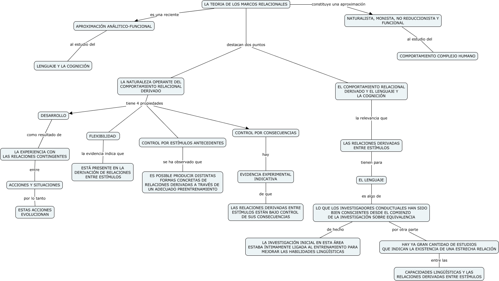 Este Cmap, tiene información relacionada con: LA TEORIA DE LOS MARCOS RELACIONALES, APROXIMACIÓN ANÁLITICO-FUNCIONAL al estudio del LENGUAJE Y LA COGNICIÓN, LA EXPERIENCIA CON LAS RELACIONES CONTINGENTES entre ACCIONES Y SITUACIONES, LA TEORIA DE LOS MARCOS RELACIONALES constituye una aproximación NATURALISTA, MONISTA, NO REDUCCIONISTA Y FUNCIONAL, LA TEORIA DE LOS MARCOS RELACIONALES es una reciente APROXIMACIÓN ANÁLITICO-FUNCIONAL, HAY YA GRAN CANTIDAD DE ESTUDIOS QUE INDICAN LA EXISTENCIA DE UNA ESTRECHA RELACIÓN entre las CAPACIDADES LINGÜÍSTICAS Y LAS RELACIONES DERIVADAS ENTRE ESTÍMULOS, LO QUE LOS INVESTIGADORES CONDUCTUALES HAN SIDO BIEN CONSCIENTES DESDE EL COMIENZO DE LA INVESTIGACIÓN SOBRE EQUIVALENCIA por otra parte HAY YA GRAN CANTIDAD DE ESTUDIOS QUE INDICAN LA EXISTENCIA DE UNA ESTRECHA RELACIÓN, EVIDENCIA EXPERIMENTAL INDICATIVA de que LAS RELACIONES DERIVADAS ENTRE ESTÍMULOS ESTÁN BAJO CONTROL DE SUS CONSECUENCIAS, LA NATURALEZA OPERANTE DEL COMPORTAMIENTO RELACIONAL DERIVADO tiene 4 propiedades CONTROL POR ESTÍMULOS ANTECEDENTES, CONTROL POR CONSECUENCIAS hay EVIDENCIA EXPERIMENTAL INDICATIVA, LO QUE LOS INVESTIGADORES CONDUCTUALES HAN SIDO BIEN CONSCIENTES DESDE EL COMIENZO DE LA INVESTIGACIÓN SOBRE EQUIVALENCIA de hecho LA INVESTIGACIÓN INICIAL EN ESTA ÁREA ESTABA ÍNTIMAMENTE LIGADA AL ENTRENAMIENTO PARA MEJORAR LAS HABILIDADES LINGÜÍSTICAS, EL COMPORTAMIENTO RELACIONAL DERIVADO Y EL LENGUAJE Y LA COGNICIÓN la relevancia que LAS RELACIONES DERIVADAS ENTRE ESTÍMULOS, CONTROL POR ESTÍMULOS ANTECEDENTES se ha observado que ES POSIBLE PRODUCIR DISTINTAS FORMAS CONCRETAS DE RELACIONES DERIVADAS A TRAVÉS DE UN ADECUADO PREENTRENAMIENTO, EL LENGUAJE es algo de LO QUE LOS INVESTIGADORES CONDUCTUALES HAN SIDO BIEN CONSCIENTES DESDE EL COMIENZO DE LA INVESTIGACIÓN SOBRE EQUIVALENCIA, LA NATURALEZA OPERANTE DEL COMPORTAMIENTO RELACIONAL DERIVADO tiene 4 propiedades CONTROL POR CONSECUENCIAS, ACCIONES Y SITUACIONES por lo tanto ESTAS ACCIONES EVOLUCIONAN, LA NATURALEZA OPERANTE DEL COMPORTAMIENTO RELACIONAL DERIVADO tiene 4 propiedades FLEXIBILIDAD, LAS RELACIONES DERIVADAS ENTRE ESTÍMULOS tienen para EL LENGUAJE, FLEXIBILIDAD la evidencia indica que ESTÁ PRESENTE EN LA DERIVACIÓN DE RELACIONES ENTRE ESTÍMULOS, LA TEORIA DE LOS MARCOS RELACIONALES destacan dos puntos LA NATURALEZA OPERANTE DEL COMPORTAMIENTO RELACIONAL DERIVADO, NATURALISTA, MONISTA, NO REDUCCIONISTA Y FUNCIONAL al estudio del COMPORTAMIENTO COMPLEJO HUMANO