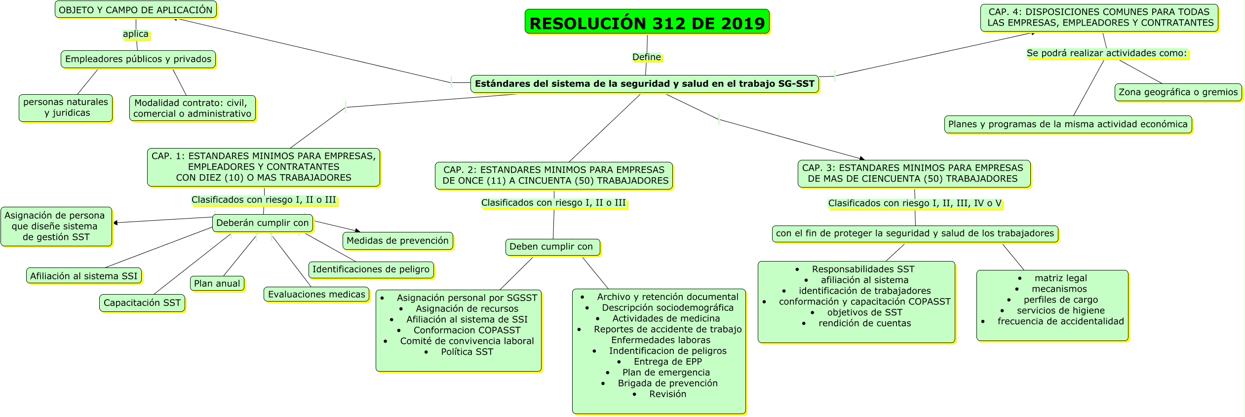 Este Cmap, tiene información relacionada con: RESOLUCION 312 DE 2019, CAP. 4: DISPOSICIONES COMUNES PARA TODAS LAS EMPRESAS, EMPLEADORES Y CONTRATANTES Se podrá realizar actividades como: Zona geográfica o gremios, OBJETO Y CAMPO DE APLICACIÓN aplica Empleadores públicos y privados, Estándares del sistema de la seguridad y salud en el trabajo SG-SST CAP. 1: ESTANDARES MINIMOS PARA EMPRESAS, EMPLEADORES Y CONTRATANTES CON DIEZ (10) O MAS TRABAJADORES, Deberán cumplir con Plan anual, Estándares del sistema de la seguridad y salud en el trabajo SG-SST OBJETO Y CAMPO DE APLICACIÓN, Deberán cumplir con Identificaciones de peligro, CAP. 1: ESTANDARES MINIMOS PARA EMPRESAS, EMPLEADORES Y CONTRATANTES CON DIEZ (10) O MAS TRABAJADORES Clasificados con riesgo I, II o III Deberán cumplir con, Empleadores públicos y privados ???? personas naturales y juridicas, CAP. 3: ESTANDARES MINIMOS PARA EMPRESAS DE MAS DE CIENCUENTA (50) TRABAJADORES Clasificados con riesgo I, II, III, IV o V con el fin de proteger la seguridad y salud de los trabajadores, Deben cumplir con • Asignación personal por SGSST • Asignación de recursos • Afiliación al sistema de SSI • Conformacion COPASST • Comité de convivencia laboral • Política SST, Deberán cumplir con Medidas de prevención, Estándares del sistema de la seguridad y salud en el trabajo SG-SST CAP. 3: ESTANDARES MINIMOS PARA EMPRESAS DE MAS DE CIENCUENTA (50) TRABAJADORES, Deben cumplir con • Archivo y retención documental • Descripción sociodemográfica • Actividades de medicina • Reportes de accidente de trabajo Enfermedades laboras • Indentificacion de peligros • Entrega de EPP • Plan de emergencia • Brigada de prevención • Revisión, Estándares del sistema de la seguridad y salud en el trabajo SG-SST CAP. 2: ESTANDARES MINIMOS PARA EMPRESAS DE ONCE (11) A CINCUENTA (50) TRABAJADORES, Estándares del sistema de la seguridad y salud en el trabajo SG-SST CAP. 4: DISPOSICIONES COMUNES PARA TODAS LAS EMPRESAS, EMPLEADORES Y CONTRATANTES, CAP. 4: DISPOSICIONES COMUNES PARA TODAS LAS EMPRESAS, EMPLEADORES Y CONTRATANTES Se podrá realizar actividades como: Planes y programas de la misma actividad económica, Empleadores públicos y privados ???? Modalidad contrato: civil, comercial o administrativo, CAP. 2: ESTANDARES MINIMOS PARA EMPRESAS DE ONCE (11) A CINCUENTA (50) TRABAJADORES Clasificados con riesgo I, II o III Deben cumplir con, Deberán cumplir con Afiliación al sistema SSI, Deberán cumplir con Evaluaciones medicas