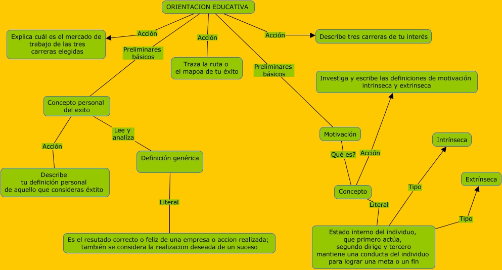 Este Cmap, tiene información relacionada con: Mapa Motivación, ORIENTACION EDUCATIVA Preliminares básicos Concepto personal del exito, Estado interno del individuo, que primero actúa, segundo dirige y tercero mantiene una conducta del individuo para lograr una meta o un fin Tipo Extrínseca, ORIENTACION EDUCATIVA Preliminares básicos Motivación, ORIENTACION EDUCATIVA Acción Explica cuál es el mercado de trabajo de las tres carreras elegidas, Concepto personal del exito Lee y analíza Definición genérica, Motivación Qué es? Concepto, Estado interno del individuo, que primero actúa, segundo dirige y tercero mantiene una conducta del individuo para lograr una meta o un fin Tipo Intrínseca, Concepto Acción Investiga y escribe las definiciones de motivación intrinseca y extrinseca, Concepto personal del exito Acción Describe tu definición personal de aquello que consideras éxtito, ORIENTACION EDUCATIVA Acción Describe tres carreras de tu interés, Concepto Literal Estado interno del individuo, que primero actúa, segundo dirige y tercero mantiene una conducta del individuo para lograr una meta o un fin, Definición genérica Literal Es el resutado correcto o feliz de una empresa o accion realizada; también se considera la realizacion deseada de un suceso, ORIENTACION EDUCATIVA Acción Traza la ruta o el mapoa de tu éxito