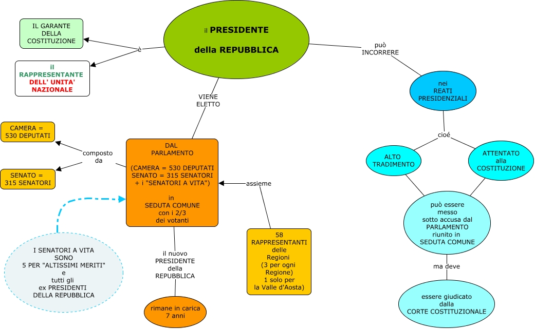 Questa Cmap, creata con IHMC CmapTools, contiene informazioni relative a: pdr, il PRESIDENTE della REPUBBLICA VIENE ELETTO DAL PARLAMENTO (CAMERA = 530 DEPUTATI SENATO = 315 SENATORI + i "SENATORI A VITA") in SEDUTA COMUNE con i 2/3 dei votanti, I SENATORI A VITA SONO 5 PER "ALTISSIMI MERITI" e tutti gli ex PRESIDENTI DELLA REPUBBLICA DAL PARLAMENTO (CAMERA = 530 DEPUTATI SENATO = 315 SENATORI + i "SENATORI A VITA") in SEDUTA COMUNE con i 2/3 dei votanti, DAL PARLAMENTO (CAMERA = 530 DEPUTATI SENATO = 315 SENATORI + i "SENATORI A VITA") in SEDUTA COMUNE con i 2/3 dei votanti il nuovo PRESIDENTE della REPUBBLICA rimane in carica 7 anni, il PRESIDENTE della REPUBBLICA è IL GARANTE DELLA COSTITUZIONE, nei REATI PRESIDENZIALI cioé ALTO TRADIMENTO, ALTO TRADIMENTO può essere messo sotto accusa dal PARLAMENTO riunito in SEDUTA COMUNE, DAL PARLAMENTO (CAMERA = 530 DEPUTATI SENATO = 315 SENATORI + i "SENATORI A VITA") in SEDUTA COMUNE con i 2/3 dei votanti composto da CAMERA = 530 DEPUTATI, il PRESIDENTE della REPUBBLICA può INCORRERE nei REATI PRESIDENZIALI, può essere messo sotto accusa dal PARLAMENTO riunito in SEDUTA COMUNE ma deve essere giudicato dalla CORTE COSTITUZIONALE, DAL PARLAMENTO (CAMERA = 530 DEPUTATI SENATO = 315 SENATORI + i "SENATORI A VITA") in SEDUTA COMUNE con i 2/3 dei votanti composto da SENATO = 315 SENATORI, ATTENTATO alla COSTITUZIONE può essere messo sotto accusa dal PARLAMENTO riunito in SEDUTA COMUNE, il PRESIDENTE della REPUBBLICA è il RAPPRESENTANTE DELL' UNITA' NAZIONALE, nei REATI PRESIDENZIALI cioé ATTENTATO alla COSTITUZIONE, 58 RAPPRESENTANTI delle Regioni (3 per ogni Regione) 1 solo per la Valle d'Aosta) assieme DAL PARLAMENTO (CAMERA = 530 DEPUTATI SENATO = 315 SENATORI + i "SENATORI A VITA") in SEDUTA COMUNE con i 2/3 dei votanti