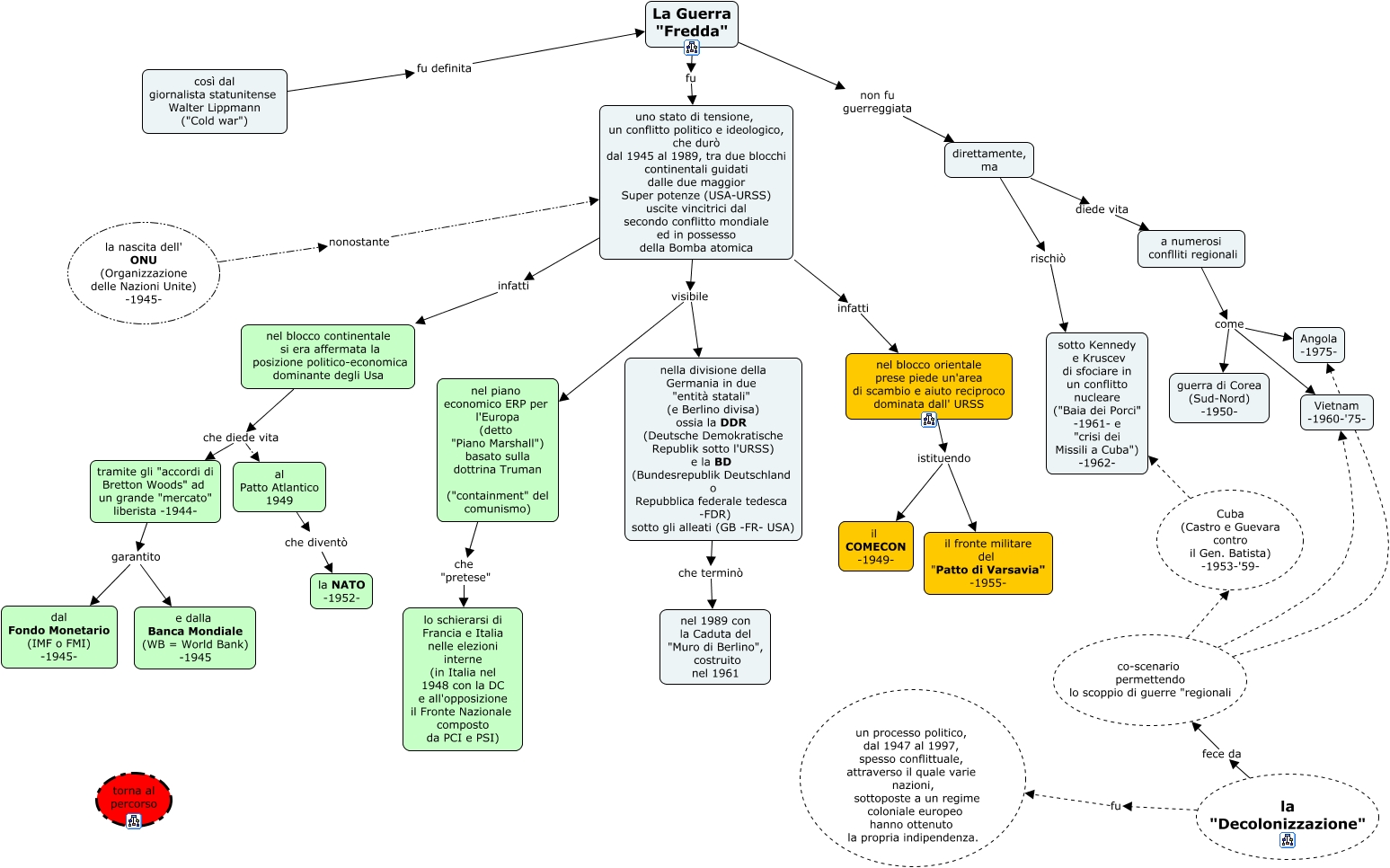Questa Cmap, creata con IHMC CmapTools, contiene informazioni relative a: guerra fredda, uno stato di tensione, un conflitto politico e ideologico, che durò dal 1945 al 1989, tra due blocchi continentali guidati dalle due maggior Super potenze (USA-URSS) uscite vincitrici dal secondo conflitto mondiale ed in possesso della Bomba atomica infatti nel blocco orientale prese piede un'area di scambio e aiuto reciproco dominata dall' URSS, così dal giornalista statunitense Walter Lippmann ("Cold war") fu definita La Guerra "Fredda", co-scenario permettendo lo scoppio di guerre "regionali Vietnam -1960-'75-, tramite gli "accordi di Bretton Woods" ad un grande "mercato" liberista -1944- garantito dal Fondo Monetario (IMF o FMI) -1945-, Cuba (Castro e Guevara contro il Gen. Batista) -1953-'59- sotto Kennedy e Kruscev di sfociare in un conflitto nucleare ("Baia dei Porci" -1961- e "crisi dei Missili a Cuba") -1962-, direttamente, ma rischiò sotto Kennedy e Kruscev di sfociare in un conflitto nucleare ("Baia dei Porci" -1961- e "crisi dei Missili a Cuba") -1962-, nel blocco continentale si era affermata la posizione politico-economica dominante degli Usa che diede vita tramite gli "accordi di Bretton Woods" ad un grande "mercato" liberista -1944-, a numerosi conflliti regionali come Vietnam -1960-'75-, la nascita dell' ONU (Organizzazione delle Nazioni Unite) -1945- nonostante uno stato di tensione, un conflitto politico e ideologico, che durò dal 1945 al 1989, tra due blocchi continentali guidati dalle due maggior Super potenze (USA-URSS) uscite vincitrici dal secondo conflitto mondiale ed in possesso della Bomba atomica, co-scenario permettendo lo scoppio di guerre "regionali Angola -1975-, nel blocco continentale si era affermata la posizione politico-economica dominante degli Usa che diede vita al Patto Atlantico 1949, tramite gli "accordi di Bretton Woods" ad un grande "mercato" liberista -1944- garantito e dalla Banca Mondiale (WB = World Bank) -1945, co-scenario permettendo lo scoppio di guerre "regionali Cuba (Castro e Guevara contro il Gen. Batista) -1953-'59-, La Guerra "Fredda" fu uno stato di tensione, un conflitto politico e ideologico, che durò dal 1945 al 1989, tra due blocchi continentali guidati dalle due maggior Super potenze (USA-URSS) uscite vincitrici dal secondo conflitto mondiale ed in possesso della Bomba atomica, a numerosi conflliti regionali come guerra di Corea (Sud-Nord) -1950-, nel blocco orientale prese piede un'area di scambio e aiuto reciproco dominata dall' URSS istituendo il COMECON -1949-, uno stato di tensione, un conflitto politico e ideologico, che durò dal 1945 al 1989, tra due blocchi continentali guidati dalle due maggior Super potenze (USA-URSS) uscite vincitrici dal secondo conflitto mondiale ed in possesso della Bomba atomica infatti nel blocco continentale si era affermata la posizione politico-economica dominante degli Usa, nel piano economico ERP per l'Europa (detto "Piano Marshall") basato sulla dottrina Truman ("containment" del comunismo) che "pretese" lo schierarsi di Francia e Italia nelle elezioni interne (in Italia nel 1948 con la DC e all'opposizione il Fronte Nazionale composto da PCI e PSI), direttamente, ma diede vita a numerosi conflliti regionali, uno stato di tensione, un conflitto politico e ideologico, che durò dal 1945 al 1989, tra due blocchi continentali guidati dalle due maggior Super potenze (USA-URSS) uscite vincitrici dal secondo conflitto mondiale ed in possesso della Bomba atomica visibile nel piano economico ERP per l'Europa (detto "Piano Marshall") basato sulla dottrina Truman ("containment" del comunismo)