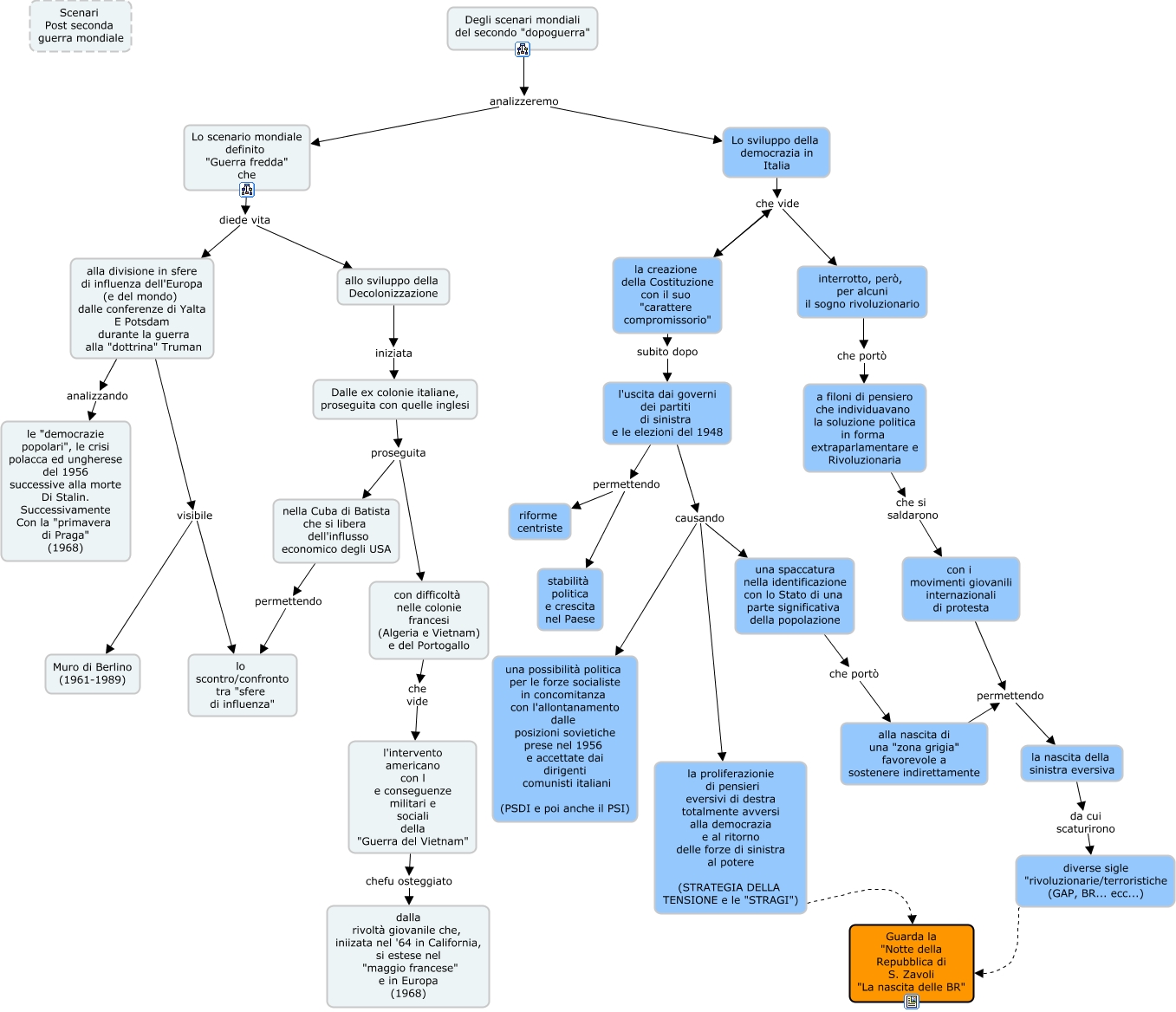 Questa Cmap, creata con IHMC CmapTools, contiene informazioni relative a: Scenari Dopoguerra, la creazione della Costituzione con il suo "carattere compromissorio" che vide interrotto, però, per alcuni il sogno rivoluzionario, interrotto, però, per alcuni il sogno rivoluzionario che portò a filoni di pensiero che individuavano la soluzione politica in forma extraparlamentare e Rivoluzionaria, l'uscita dai governi dei partiti di sinistra e le elezioni del 1948 causando una possibilità politica per le forze socialiste in concomitanza con l'allontanamento dalle posizioni sovietiche prese nel 1956 e accettate dai dirigenti comunisti italiani (PSDI e poi anche il PSI), nella Cuba di Batista che si libera dell'influsso economico degli USA permettendo lo scontro/confronto tra "sfere di influenza", alla divisione in sfere di influenza dell'Europa (e del mondo) dalle conferenze di Yalta E Potsdam durante la guerra alla "dottrina" Truman visibile Muro di Berlino (1961-1989), una spaccatura nella identificazione con lo Stato di una parte significativa della popolazione che portò alla nascita di una "zona grigia" favorevole a sostenere indirettamente, Degli scenari mondiali del secondo "dopoguerra" analizzeremo Lo scenario mondiale definito "Guerra fredda" che, l'uscita dai governi dei partiti di sinistra e le elezioni del 1948 causando una spaccatura nella identificazione con lo Stato di una parte significativa della popolazione, la nascita della sinistra eversiva da cui scaturirono diverse sigle "rivoluzionarie/terroristiche (GAP, BR... ecc...), l'intervento americano con l e conseguenze militari e sociali della "Guerra del Vietnam" chefu osteggiato dalla rivoltà giovanile che, iniizata nel '64 in California, si estese nel "maggio francese" e in Europa (1968), Dalle ex colonie italiane, proseguita con quelle inglesi proseguita con difficoltà nelle colonie francesi (Algeria e Vietnam) e del Portogallo, Lo sviluppo della democrazia in Italia che vide la creazione della Costituzione con il suo "carattere compromissorio", a filoni di pensiero che individuavano la soluzione politica in forma extraparlamentare e Rivoluzionaria che si saldarono con i movimenti giovanili internazionali di protesta, Degli scenari mondiali del secondo "dopoguerra" analizzeremo Lo sviluppo della democrazia in Italia, alla divisione in sfere di influenza dell'Europa (e del mondo) dalle conferenze di Yalta E Potsdam durante la guerra alla "dottrina" Truman analizzando le "democrazie popolari", le crisi polacca ed ungherese del 1956 successive alla morte Di Stalin. Successivamente Con la "primavera di Praga" (1968), allo sviluppo della Decolonizzazione iniziata Dalle ex colonie italiane, proseguita con quelle inglesi, la proliferazionie di pensieri eversivi di destra totalmente avversi alla democrazia e al ritorno delle forze di sinistra al potere (STRATEGIA DELLA TENSIONE e le "STRAGI") Guarda la "Notte della Repubblica di S. Zavoli "La nascita delle BR", l'uscita dai governi dei partiti di sinistra e le elezioni del 1948 causando la proliferazionie di pensieri eversivi di destra totalmente avversi alla democrazia e al ritorno delle forze di sinistra al potere (STRATEGIA DELLA TENSIONE e le "STRAGI"), Lo scenario mondiale definito "Guerra fredda" che diede vita alla divisione in sfere di influenza dell'Europa (e del mondo) dalle conferenze di Yalta E Potsdam durante la guerra alla "dottrina" Truman, alla divisione in sfere di influenza dell'Europa (e del mondo) dalle conferenze di Yalta E Potsdam durante la guerra alla "dottrina" Truman visibile lo scontro/confronto tra "sfere di influenza"