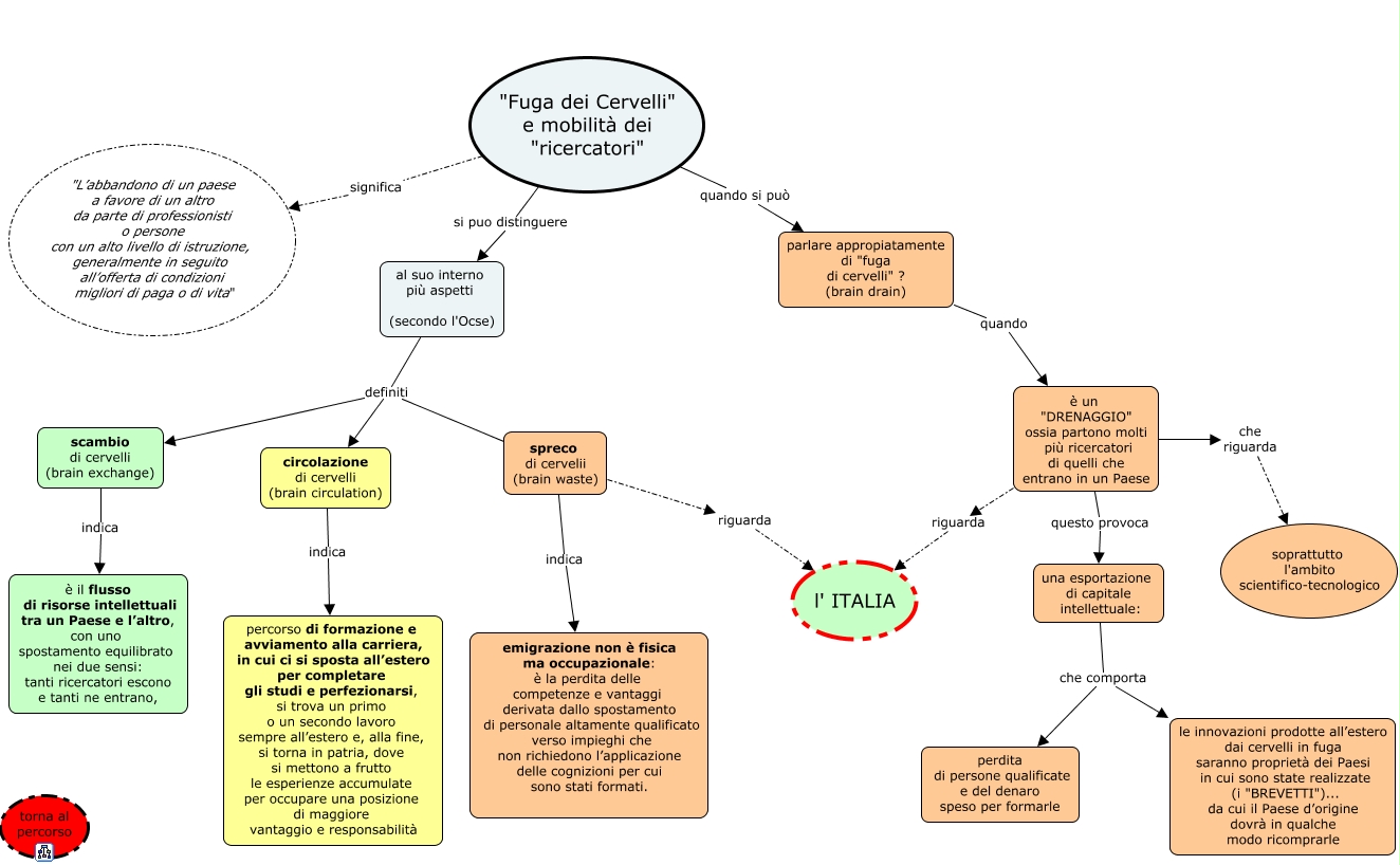 Questa Cmap, creata con IHMC CmapTools, contiene informazioni relative a: fuga, "Fuga dei Cervelli" e mobilità dei "ricercatori" si puo distinguere al suo interno più aspetti (secondo l'Ocse), "Fuga dei Cervelli" e mobilità dei "ricercatori" significa "L’abbandono di un paese a favore di un altro da parte di professionisti o persone con un alto livello di istruzione, generalmente in seguito all’offerta di condizioni migliori di paga o di vita", al suo interno più aspetti (secondo l'Ocse) definiti scambio di cervelli (brain exchange), spreco di cervelii (brain waste) indica emigrazione non è fisica ma occupazionale: è la perdita delle competenze e vantaggi derivata dallo spostamento di personale altamente qualificato verso impieghi che non richiedono l’applicazione delle cognizioni per cui sono stati formati., una esportazione di capitale intellettuale: che comporta le innovazioni prodotte all’estero dai cervelli in fuga saranno proprietà dei Paesi in cui sono state realizzate (i "BREVETTI")... da cui il Paese d’origine dovrà in qualche modo ricomprarle, scambio di cervelli (brain exchange) indica è il flusso di risorse intellettuali tra un Paese e l’altro, con uno spostamento equilibrato nei due sensi: tanti ricercatori escono e tanti ne entrano,, è un "DRENAGGIO" ossia partono molti più ricercatori di quelli che entrano in un Paese questo provoca una esportazione di capitale intellettuale:, "Fuga dei Cervelli" e mobilità dei "ricercatori" quando si può parlare appropiatamente di "fuga di cervelli" ? (brain drain), al suo interno più aspetti (secondo l'Ocse) definiti spreco di cervelii (brain waste), è un "DRENAGGIO" ossia partono molti più ricercatori di quelli che entrano in un Paese che riguarda soprattutto l'ambito scientifico-tecnologico, spreco di cervelii (brain waste) riguarda l' ITALIA, una esportazione di capitale intellettuale: che comporta perdita di persone qualificate e del denaro speso per formarle, è un "DRENAGGIO" ossia partono molti più ricercatori di quelli che entrano in un Paese riguarda l' ITALIA, al suo interno più aspetti (secondo l'Ocse) definiti circolazione di cervelli (brain circulation), circolazione di cervelli (brain circulation) indica percorso di formazione e avviamento alla carriera, in cui ci si sposta all’estero per completare gli studi e perfezionarsi, si trova un primo o un secondo lavoro sempre all’estero e, alla fine, si torna in patria, dove si mettono a frutto le esperienze accumulate per occupare una posizione di maggiore vantaggio e responsabilità, parlare appropiatamente di "fuga di cervelli" ? (brain drain) quando è un "DRENAGGIO" ossia partono molti più ricercatori di quelli che entrano in un Paese