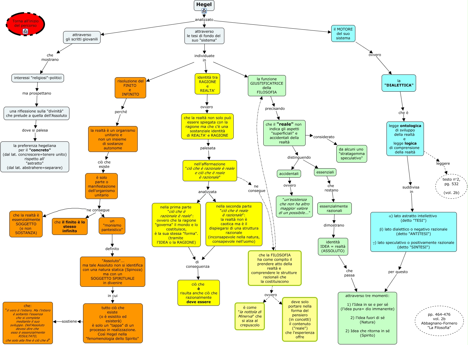 Questa Cmap, creata con IHMC CmapTools, contiene informazioni relative a: Hegel 1, identità tra RAGIONE e REALTA' ovvero che la realtà non solo può essere spiegata con la ragione ma che c'è una sostanziale identità di REALTA' e RAGIONE, nell'affermazione "ciò che è razionale è reale e ciò che è reale è razionale" analizzata nella prima parte "ciò che è razionale è reale": ovvero che la ragione "governa" il mondo e lo costituisce, è la sua stessa "forma". (tramite l'IDEA o la RAGIONE), legge ontologica di sviluppo della realtà e legge logica di comprensione della realtà suddivisa in α) lato astratto intellettivo (detto "TESI") β) lato dialettico o negativo razionale (detto "ANTITESI") γ) lato speculativo o positivamente razionale (detto "SINTESI"), attraverso gli scritti giovanili che mostrano interessi "religiosi"-politici, che la realtà non solo può essere spiegata con la ragione ma che c'è una sostanziale identità di REALTA' e RAGIONE palesata nell'affermazione "ciò che è razionale è reale e ciò che è reale è razionale", che la FILOSOFIA ha come compito il prendere atto della realtà e comprendere le strutture razionali che la costituiscono ovvero deve solo portare nella forma del pensiero (in concetti) il contenuto ("reale") che l'esperienza offre, Hegel analizzato il MOTORE del suo sistema, attraverso le tesi di fondo del suo "sistema" individuate in identità tra RAGIONE e REALTA', nella seconda parte "ciò che è reale è razionale": la realtà non è caotica ma è il dispiegarsi di una struttura razionale (inconsapevole nella natura, consapevole nell'uomo) di conseguenza ciò che è risulta anche ciò che razionalmente deve essere, "Assoluto"... ma tale Assoluto non si identifica con una natura statica (Spinoza) ma con un SOGGETTO SPIRITUALE in divenire in cui tutto ciò che esiste (o è esistito ed esisterà) è solo un "tappa" di un processo in realizzazione. Così Hegel nella "fenomenologia dello Spirito", nell'affermazione "ciò che è razionale è reale e ciò che è reale è razionale" analizzata nella seconda parte "ciò che è reale è razionale": la realtà non è caotica ma è il dispiegarsi di una struttura razionale (inconsapevole nella natura, consapevole nell'uomo), α) lato astratto intellettivo (detto "TESI") β) lato dialettico o negativo razionale (detto "ANTITESI") γ) lato speculativo o positivamente razionale (detto "SINTESI") per questo attraverso tre momenti: 1) l'Idea in se e per sé (l'idea pura= dio immanente) 2) l'idea fuori di sé (Natura) 2) Idea che ritorna in sé (Spirito), che il "reale" non indica gli aspetti "superficiali" e accidentali della realtà distinguendo essenziali, risoluzione del FINITO e INFINITO perché la realtà è un organismo unitario e non un insieme di sostanze autonome, attraverso le tesi di fondo del suo "sistema" individuate in la funzione GIUSTIFICATRICE della FILOSOFIA, Hegel analizzato attraverso gli scritti giovanili, il MOTORE del suo sistema ovvero la "DIALETTICA", è solo parte o manifestazione dell'organismo unitario ne consegue che il finito è lo stesso infinito, la "DIALETTICA" che è legge ontologica di sviluppo della realtà e legge logica di comprensione della realtà, un "monismo panteistico" definito "Assoluto"... ma tale Assoluto non si identifica con una natura statica (Spinoza) ma con un SOGGETTO SPIRITUALE in divenire